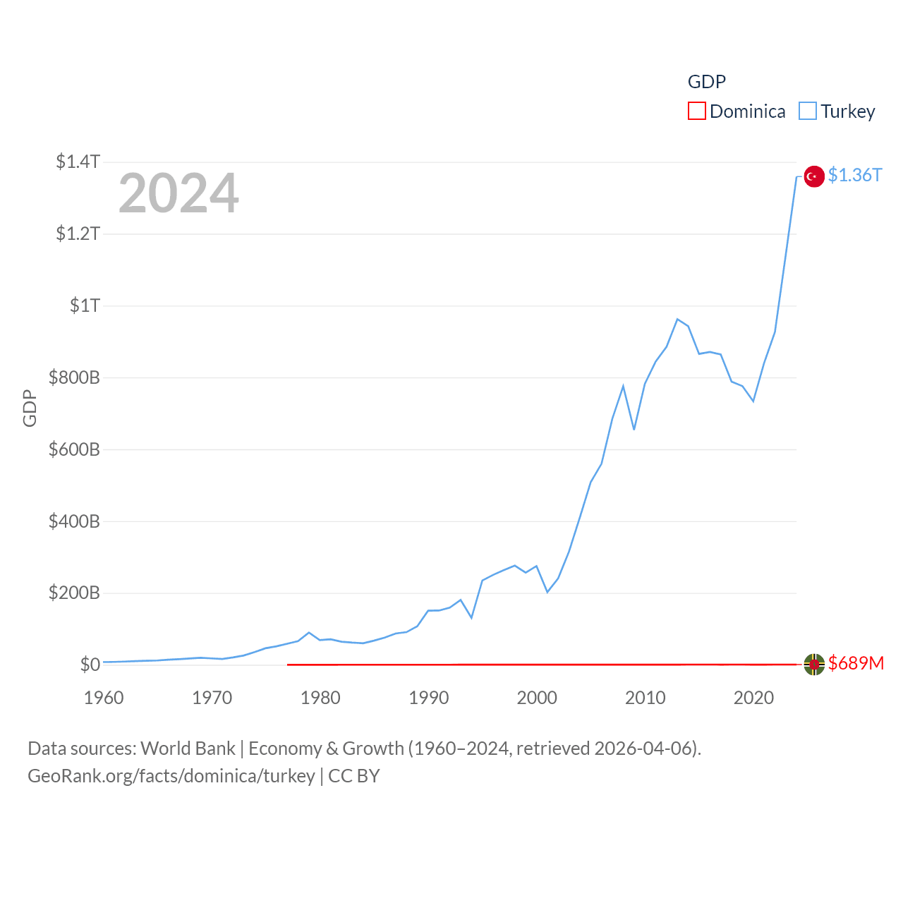 By GDP, Dominica ranks 190/197 ($689M) and Turkey ranks 17/197 ($1.36T). By GDP per capita, Dominica ranks 84/197 ($10,405), while Turkey ranks 66/197 ($15,893).