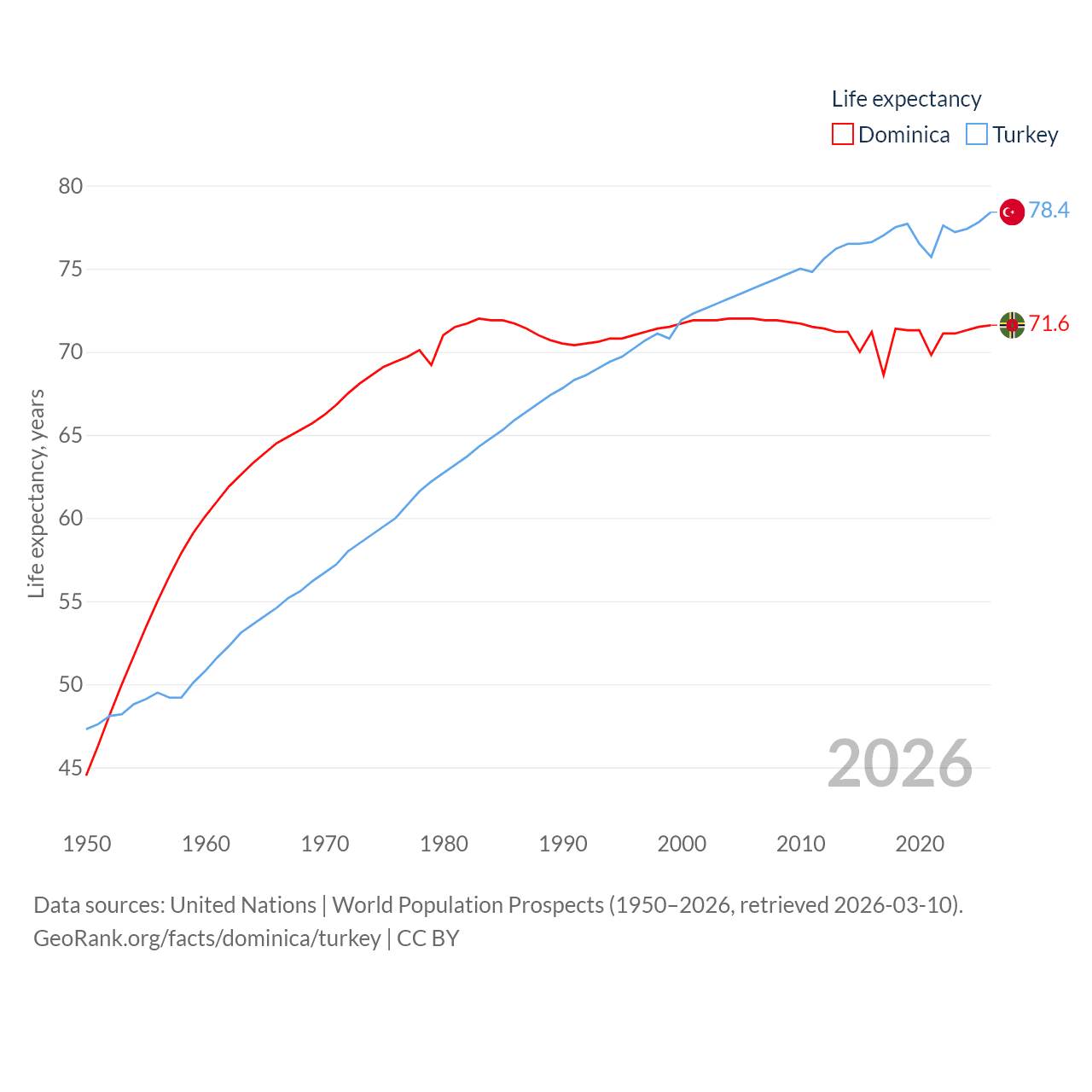 Dominica has a population of 66.2K (ranked 188/197), compared with 85.5M in Turkey (ranked 18/197). Dominica's land area is 289.6 sq mi versus 297,156 sq mi for Turkey (ranked 175th vs. 36th).