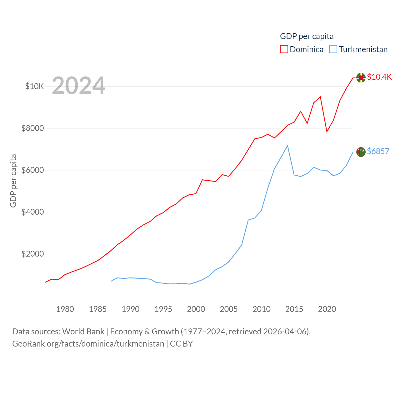 By GDP, Dominica ranks 190/197 ($689M) and Turkmenistan ranks 92/197 ($51.4B). By GDP per capita, Dominica ranks 84/197 ($10,405), while Turkmenistan ranks 104/197 ($6,857).