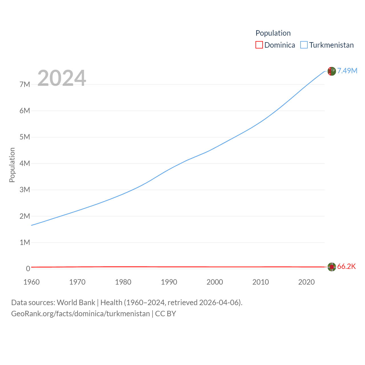 Dominica has a population of 66.2K (ranked 188/197), compared with 7.49M in Turkmenistan (ranked 104/197). Dominica's land area is 289.6 sq mi versus 181,441 sq mi for Turkmenistan (ranked 175th vs. 53rd).