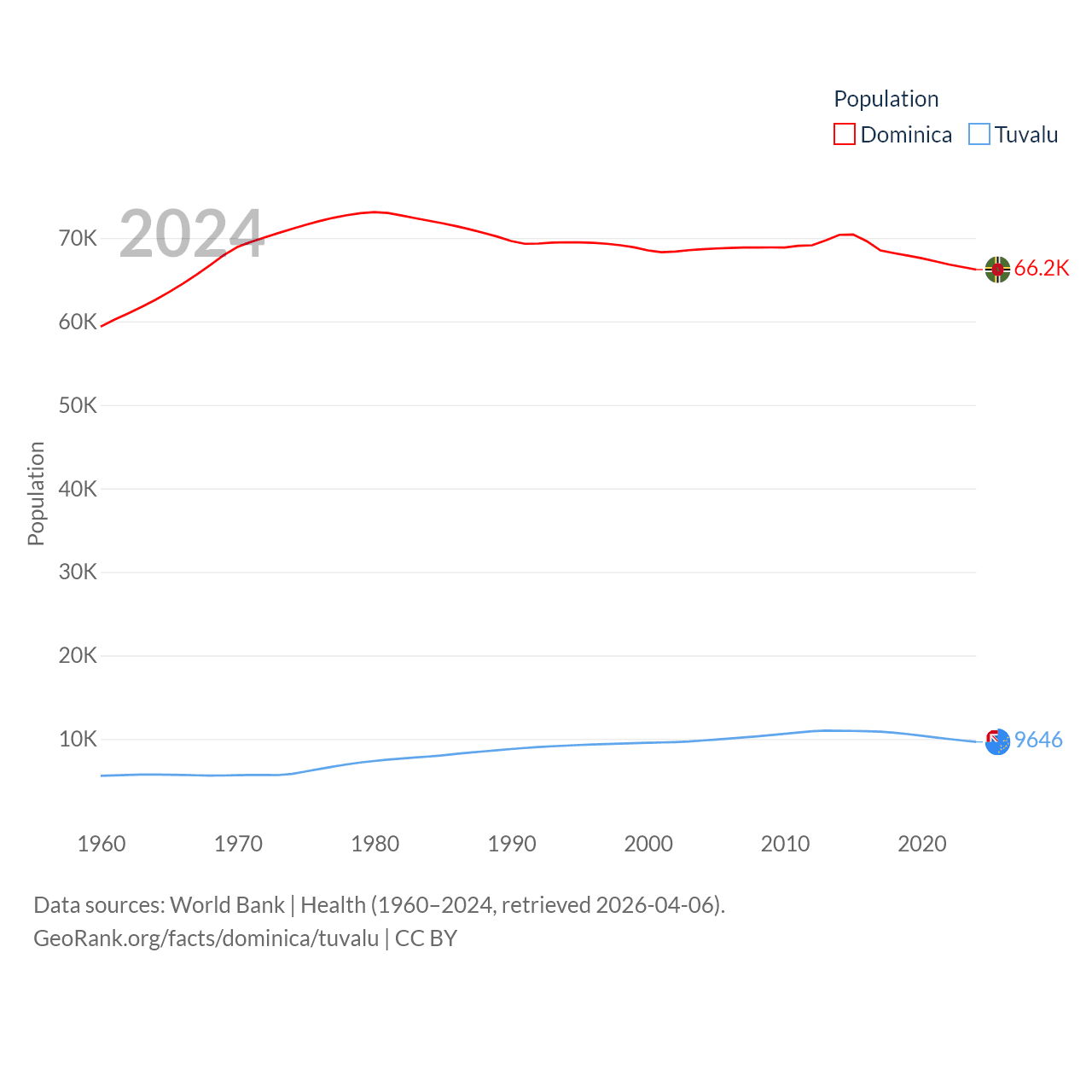 Dominica has a population of 66.2K (ranked 188/197), compared with 9.65K in Tuvalu (ranked 196/197). Dominica's land area is 289.6 sq mi versus 11.6 sq mi for Tuvalu (ranked 175th vs. 194th).