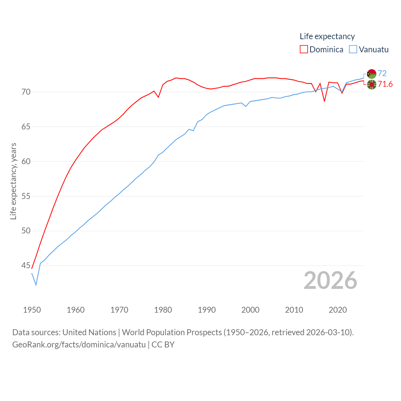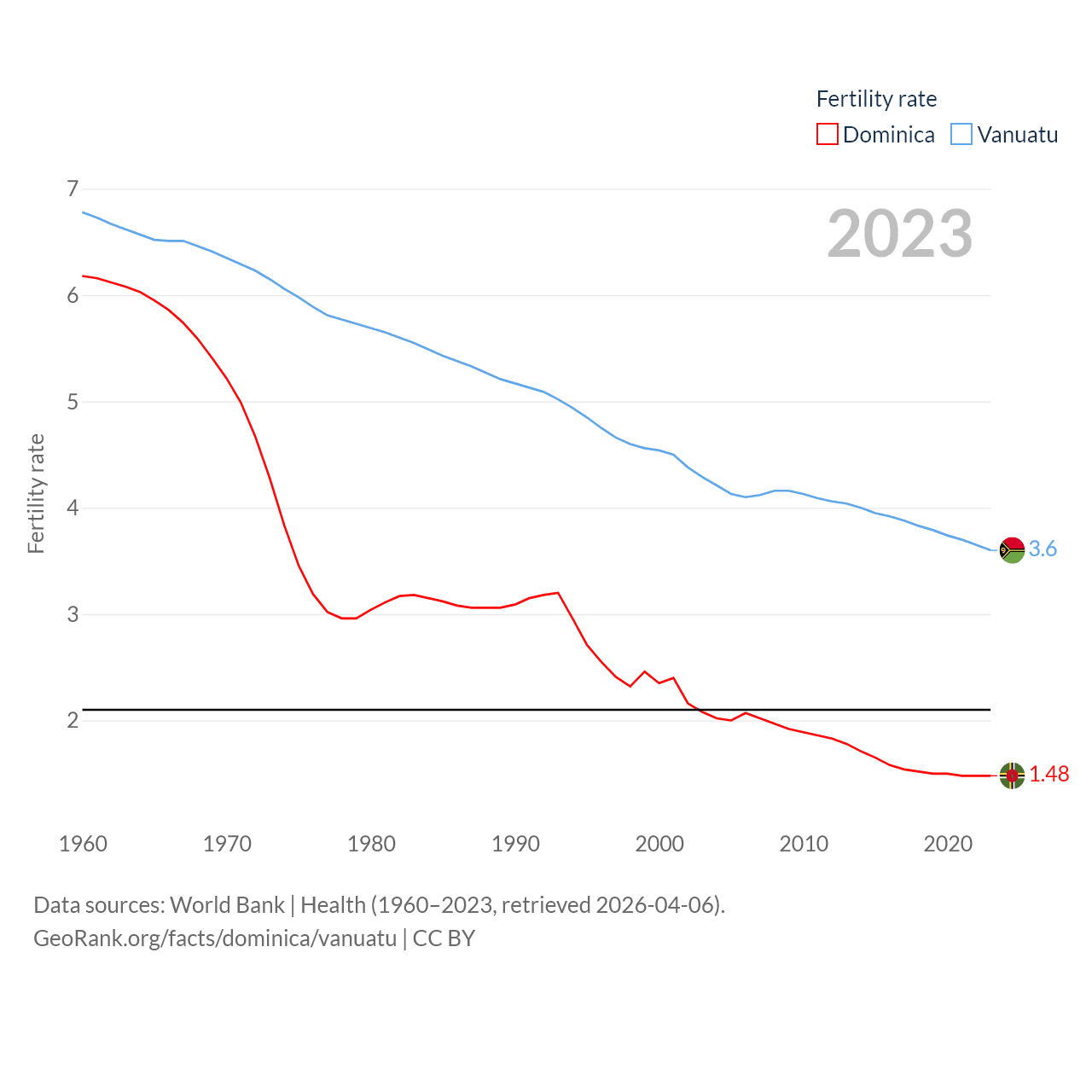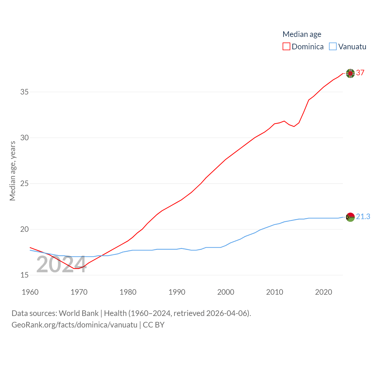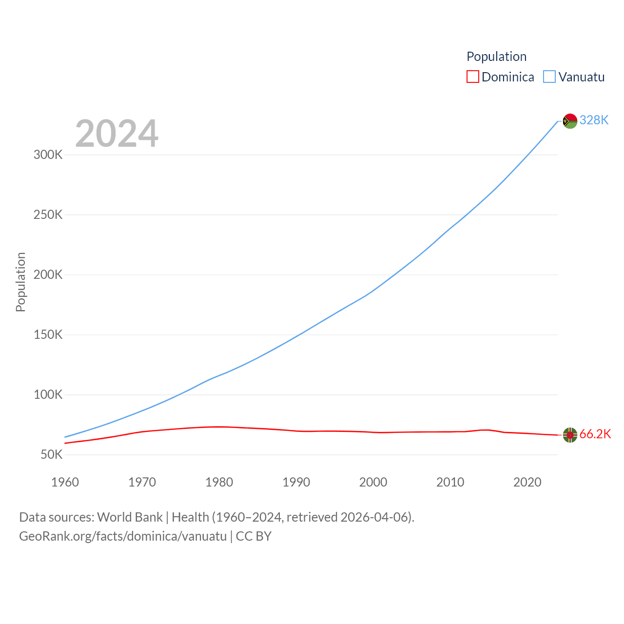 Dominica has a population of 66.2K (ranked 188/197), compared with 328K in Vanuatu (ranked 174/197). Dominica's land area is 289.6 sq mi versus 4,707 sq mi for Vanuatu (ranked 175th vs. 157th).
