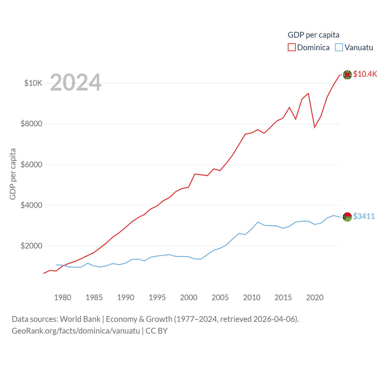 By GDP, Dominica ranks 190/197 ($689M) and Vanuatu ranks 188/197 ($1.12B). By GDP per capita, Dominica ranks 84/197 ($10,405), while Vanuatu ranks 137/197 ($3,411).