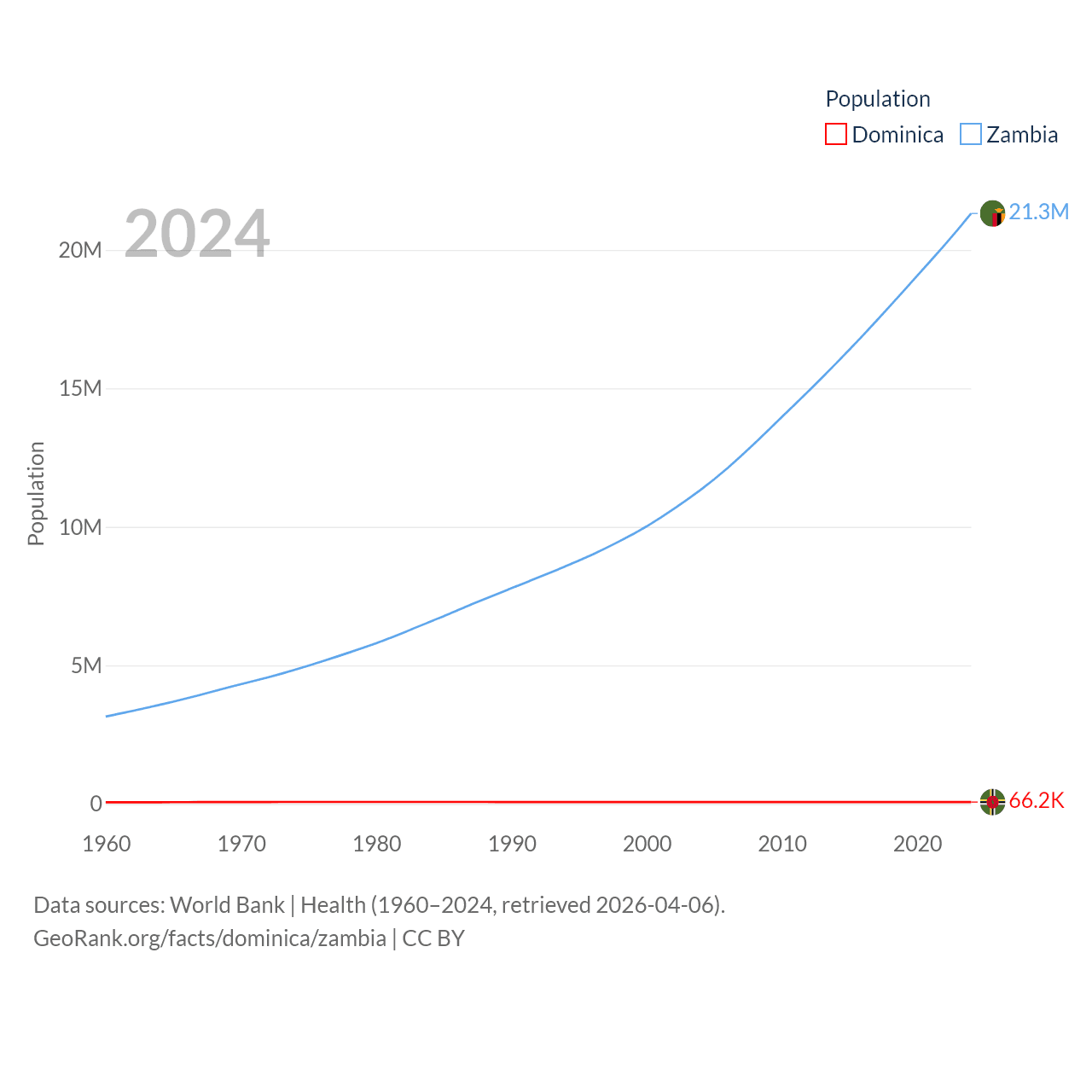 Dominica has a population of 66.2K (ranked 188/197), compared with 21.3M in Zambia (ranked 63/197). Dominica's land area is 289.6 sq mi versus 287,024 sq mi for Zambia (ranked 175th vs. 37th).