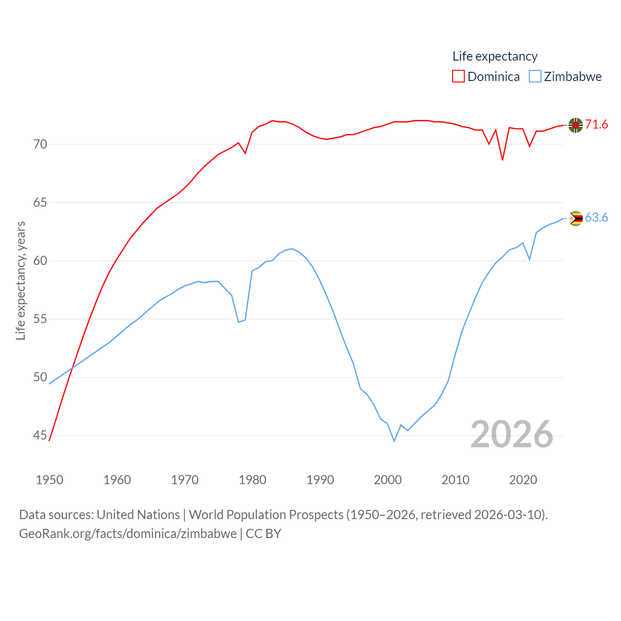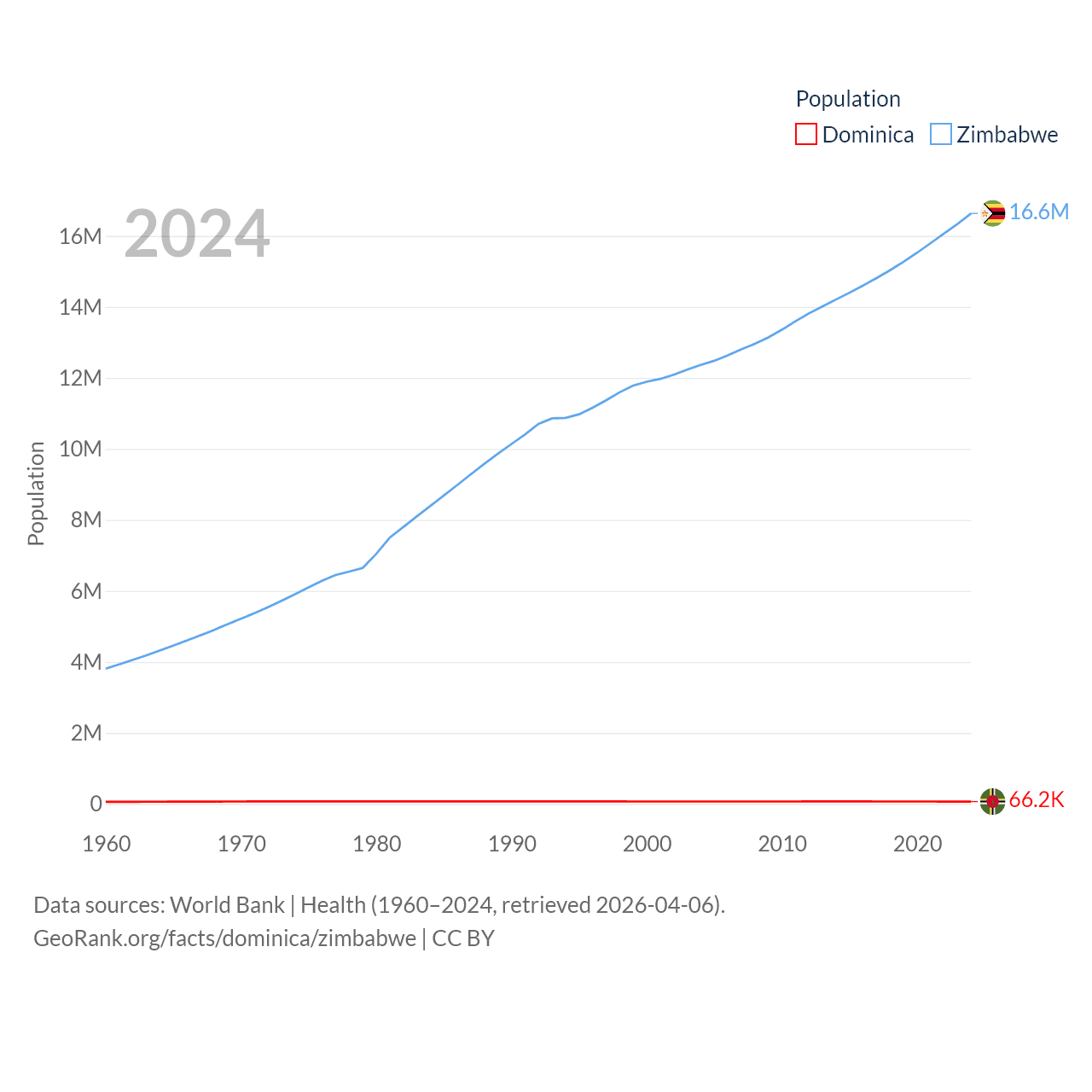 Dominica has a population of 66.2K (ranked 188/197), compared with 16.6M in Zimbabwe (ranked 74/197). Dominica's land area is 289.6 sq mi versus 149,364 sq mi for Zimbabwe (ranked 175th vs. 60th).