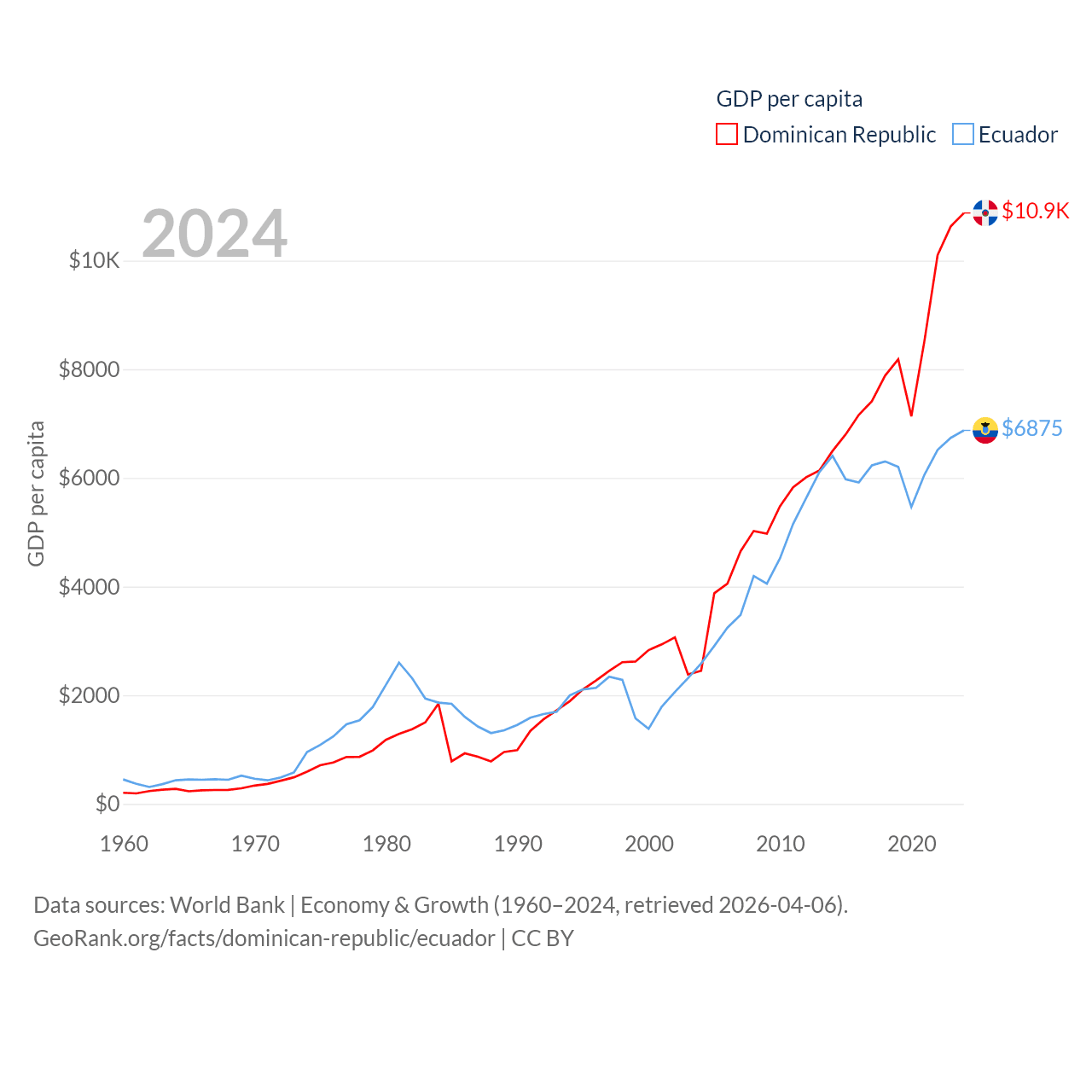 By GDP, The Dominican Republic ranks 63/197 ($124B) and Ecuador ranks 62/197 ($125B). By GDP per capita, The Dominican Republic ranks 83/197 ($10,876), while Ecuador ranks 103/197 ($6,875).