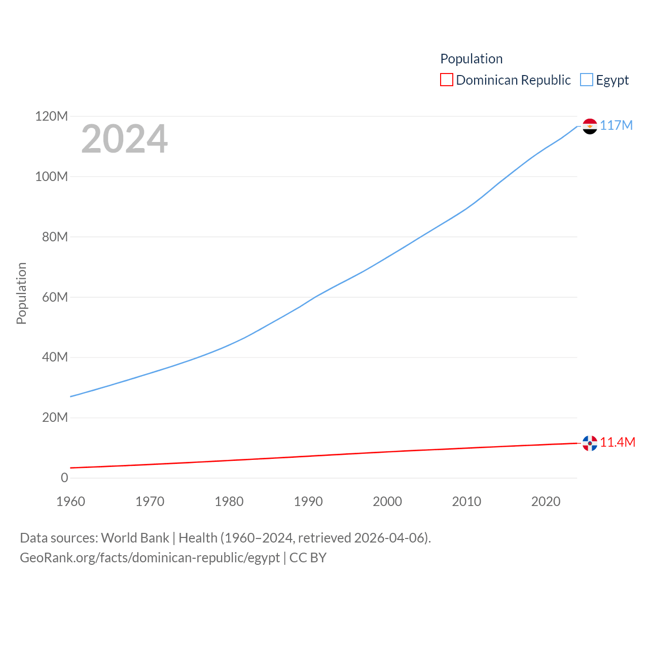 The Dominican Republic has a population of 11.4M (ranked 85/197), compared with 117M in Egypt (ranked 13/197). The Dominican Republic's land area is 18,609 sq mi versus 384,345 sq mi for Egypt (ranked 127th vs. 29th).