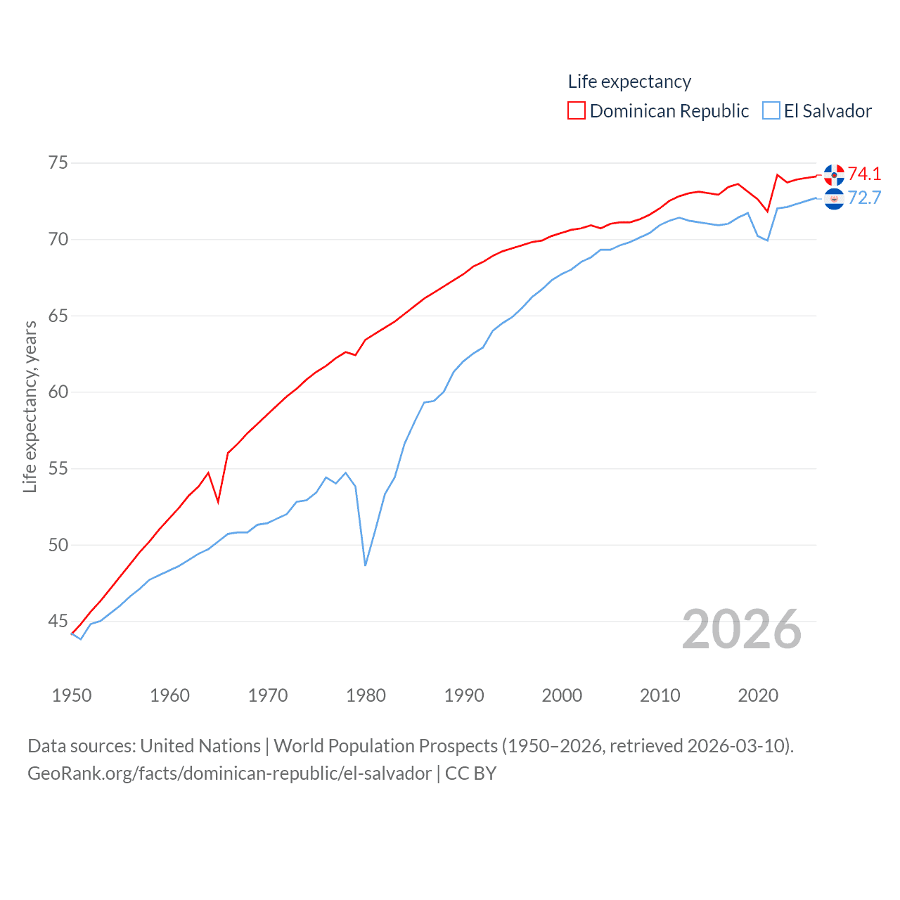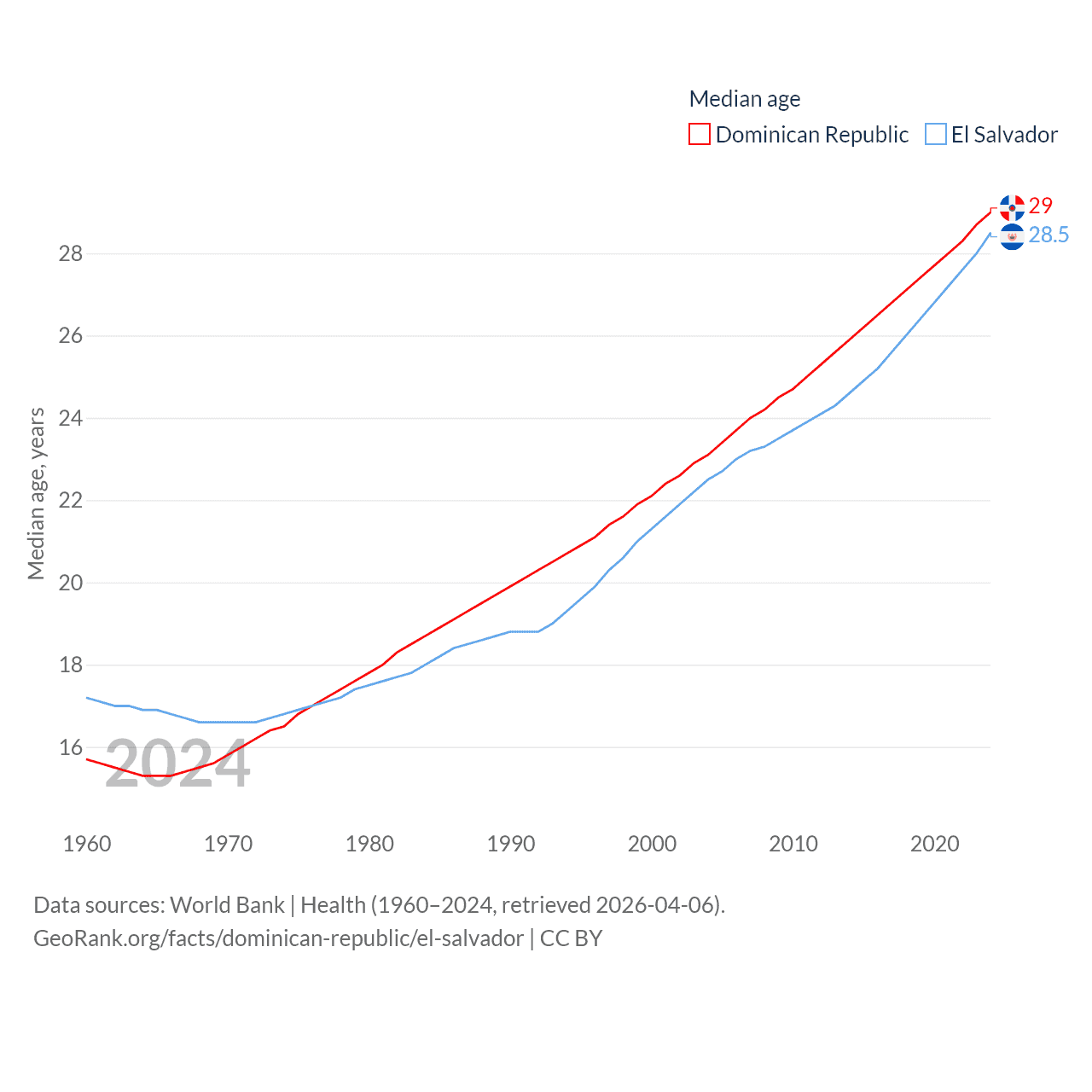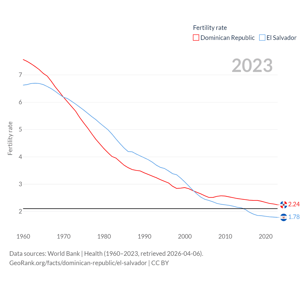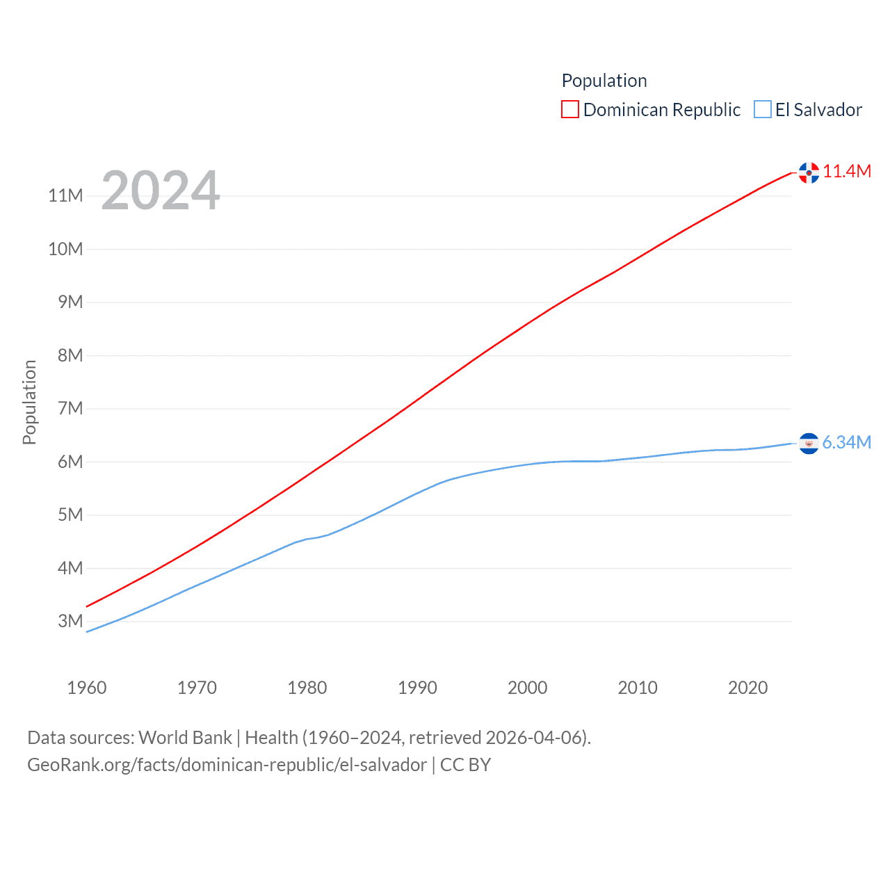 The Dominican Republic has a population of 11.4M (ranked 85/197), compared with 6.34M in El Salvador (ranked 111/197). The Dominican Republic's land area is 18,609 sq mi versus 8,000 sq mi for El Salvador (ranked 127th vs. 150th).