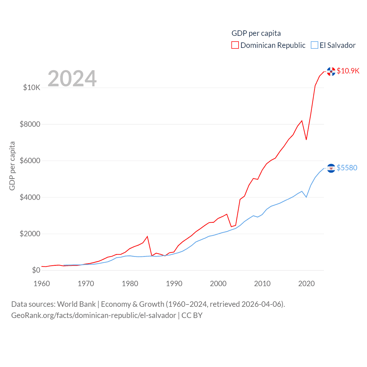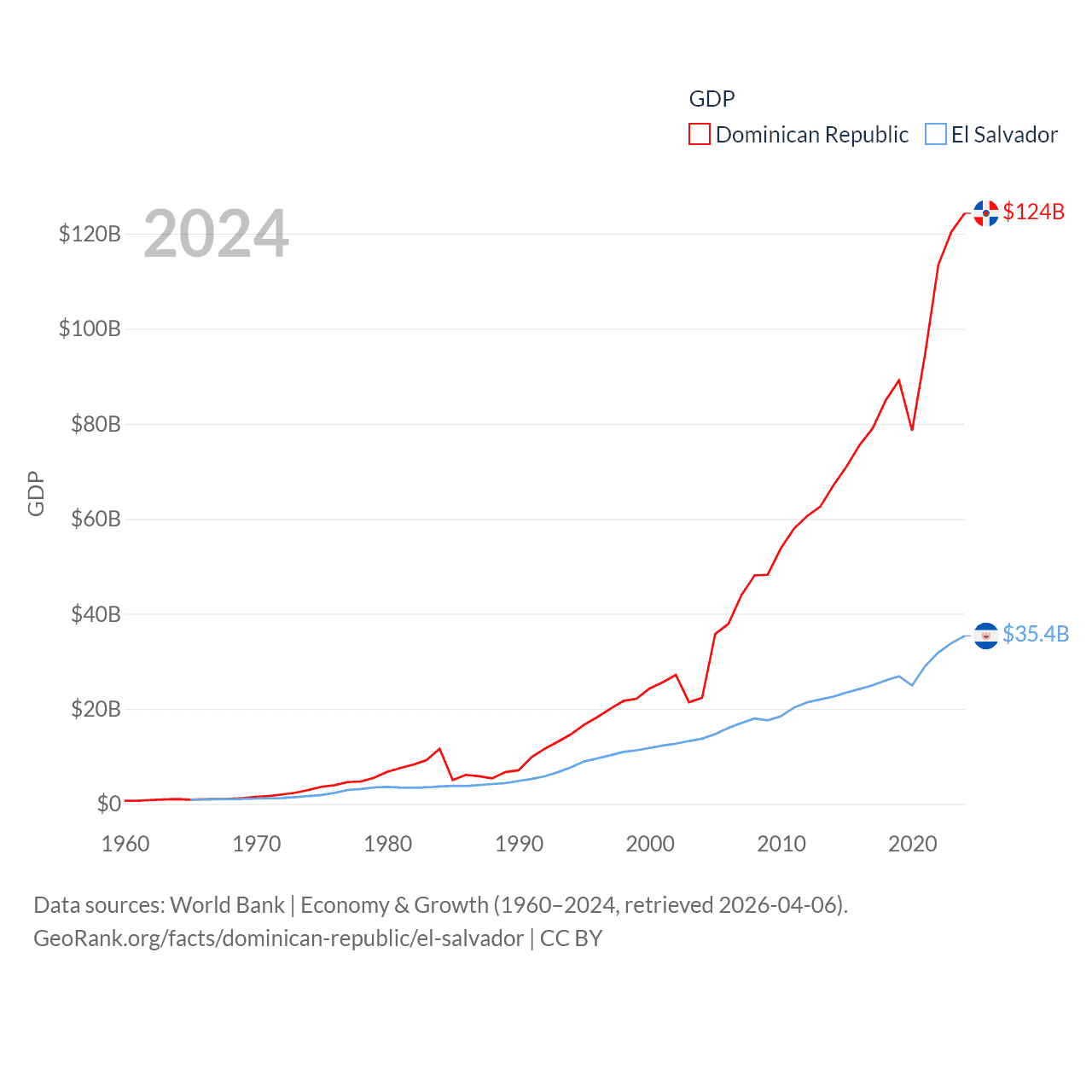 By GDP, The Dominican Republic ranks 63/197 ($124B) and El Salvador ranks 105/197 ($35.4B). By GDP per capita, The Dominican Republic ranks 83/197 ($10,876), while El Salvador ranks 116/197 ($5,580).