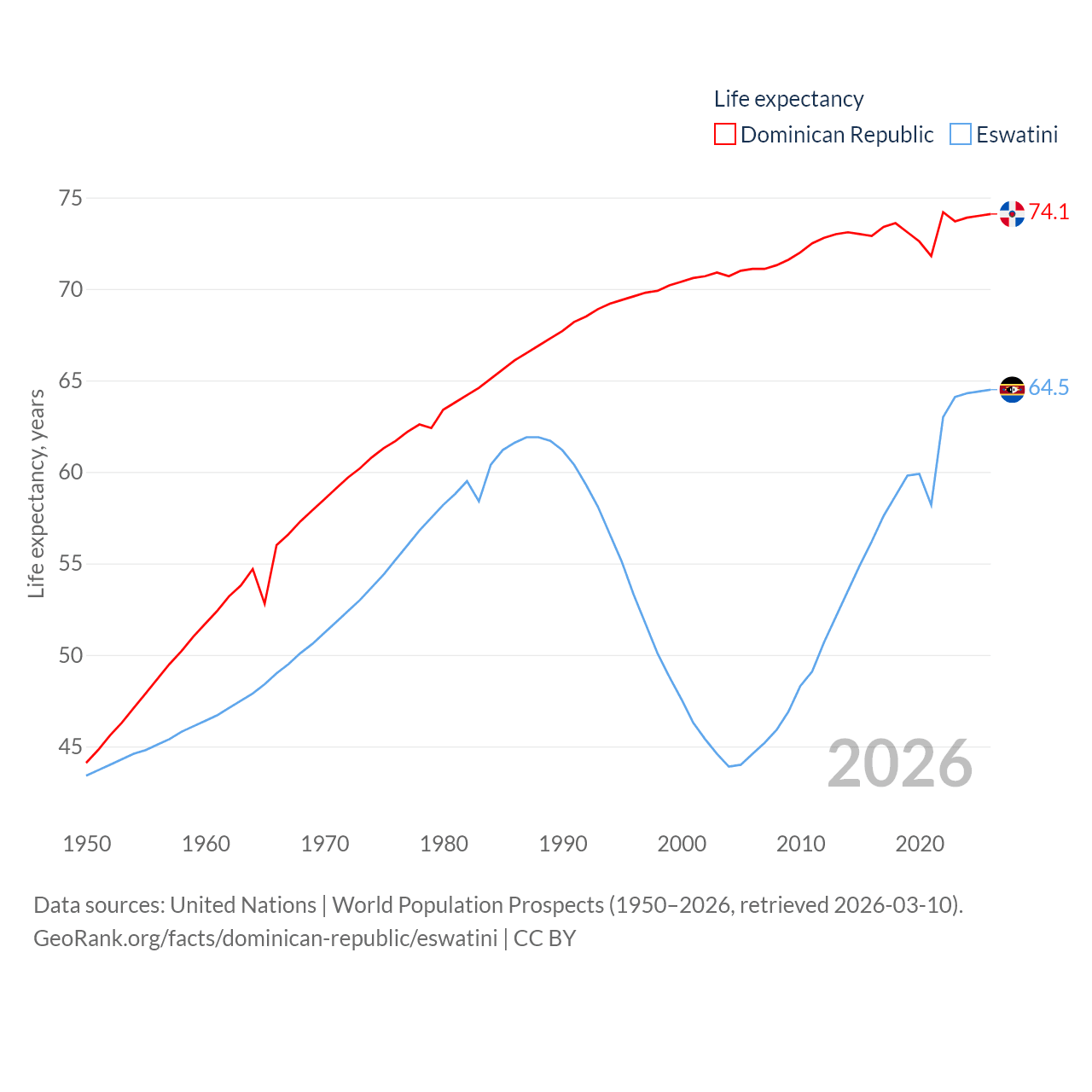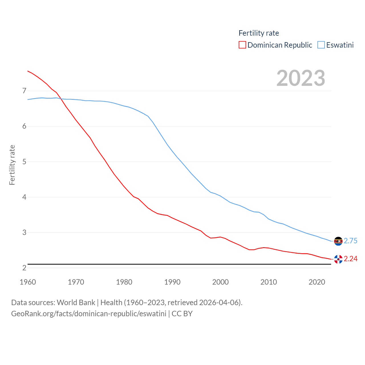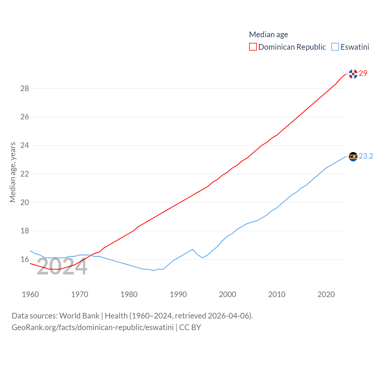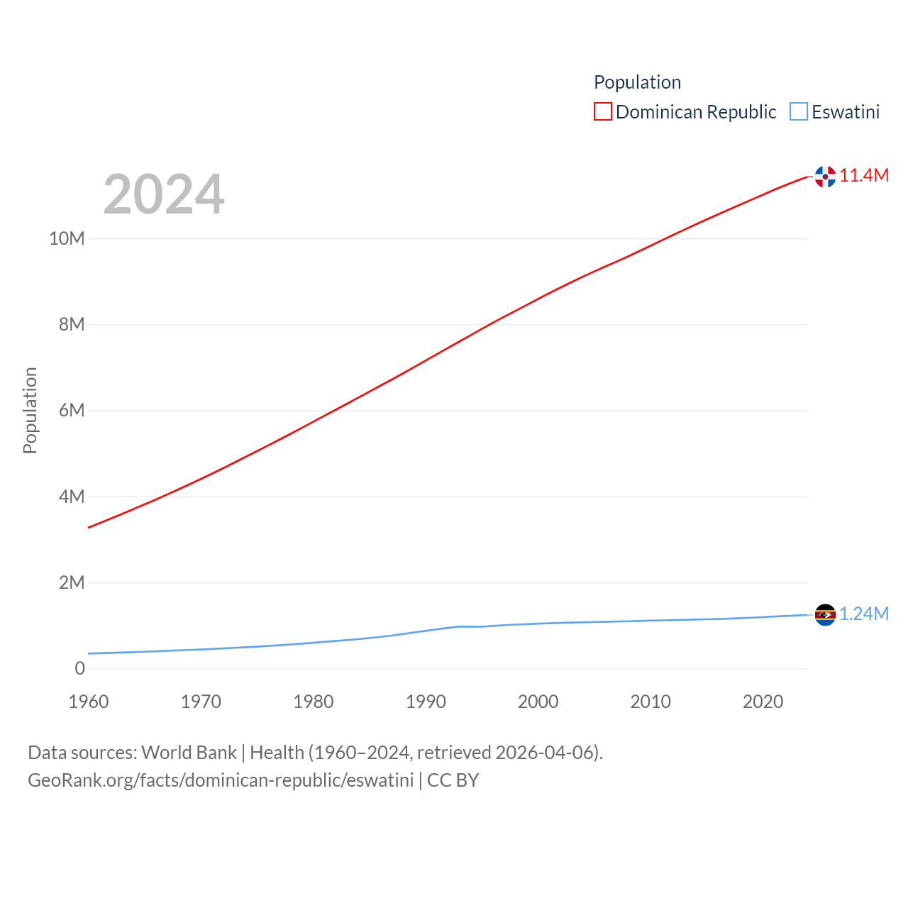 The Dominican Republic has a population of 11.4M (ranked 85/197), compared with 1.24M in Eswatini (ranked 157/197). The Dominican Republic's land area is 18,609 sq mi versus 6,641 sq mi for Eswatini (ranked 127th vs. 154th).