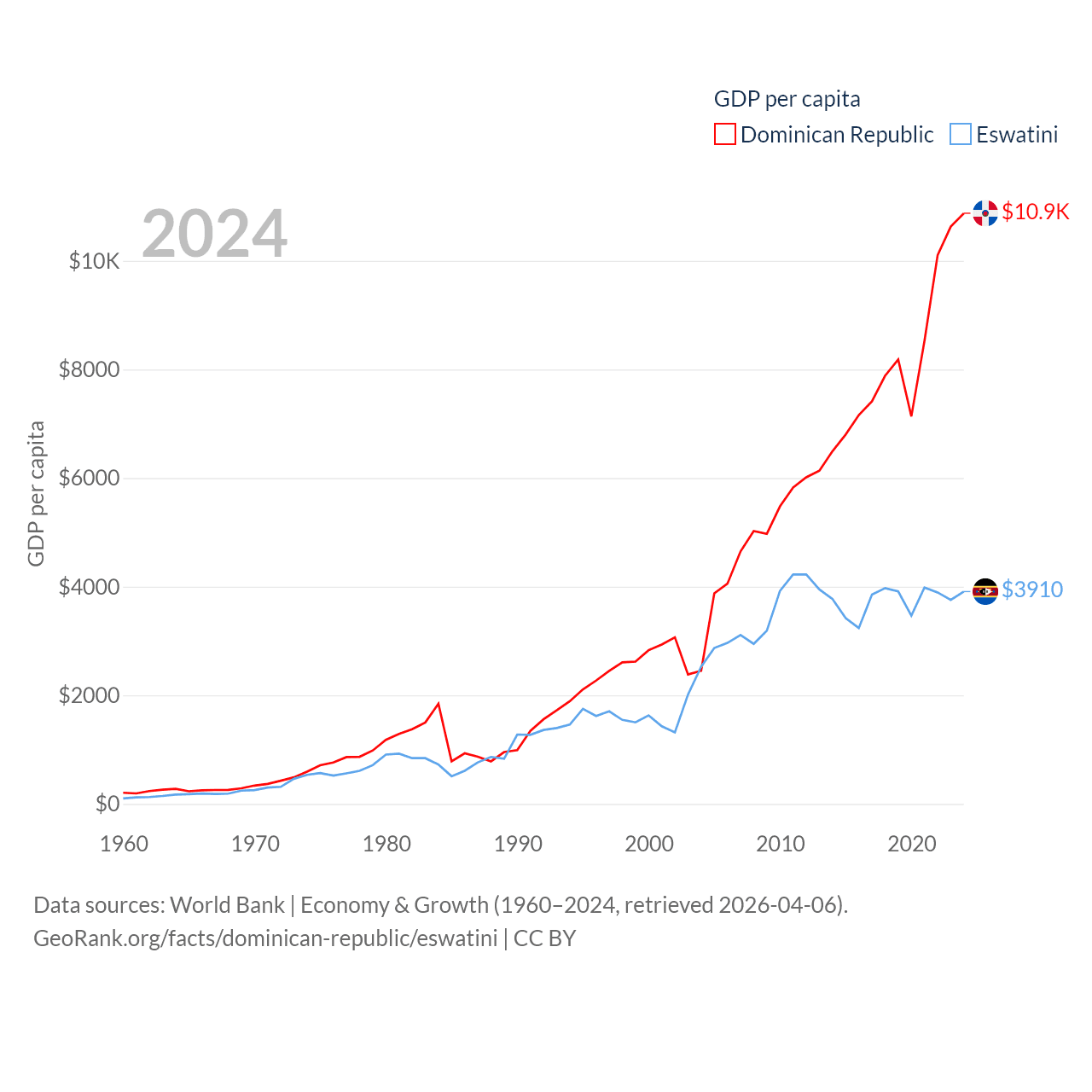 By GDP, The Dominican Republic ranks 63/197 ($124B) and Eswatini ranks 162/197 ($4.86B). By GDP per capita, The Dominican Republic ranks 83/197 ($10,876), while Eswatini ranks 131/197 ($3,910).