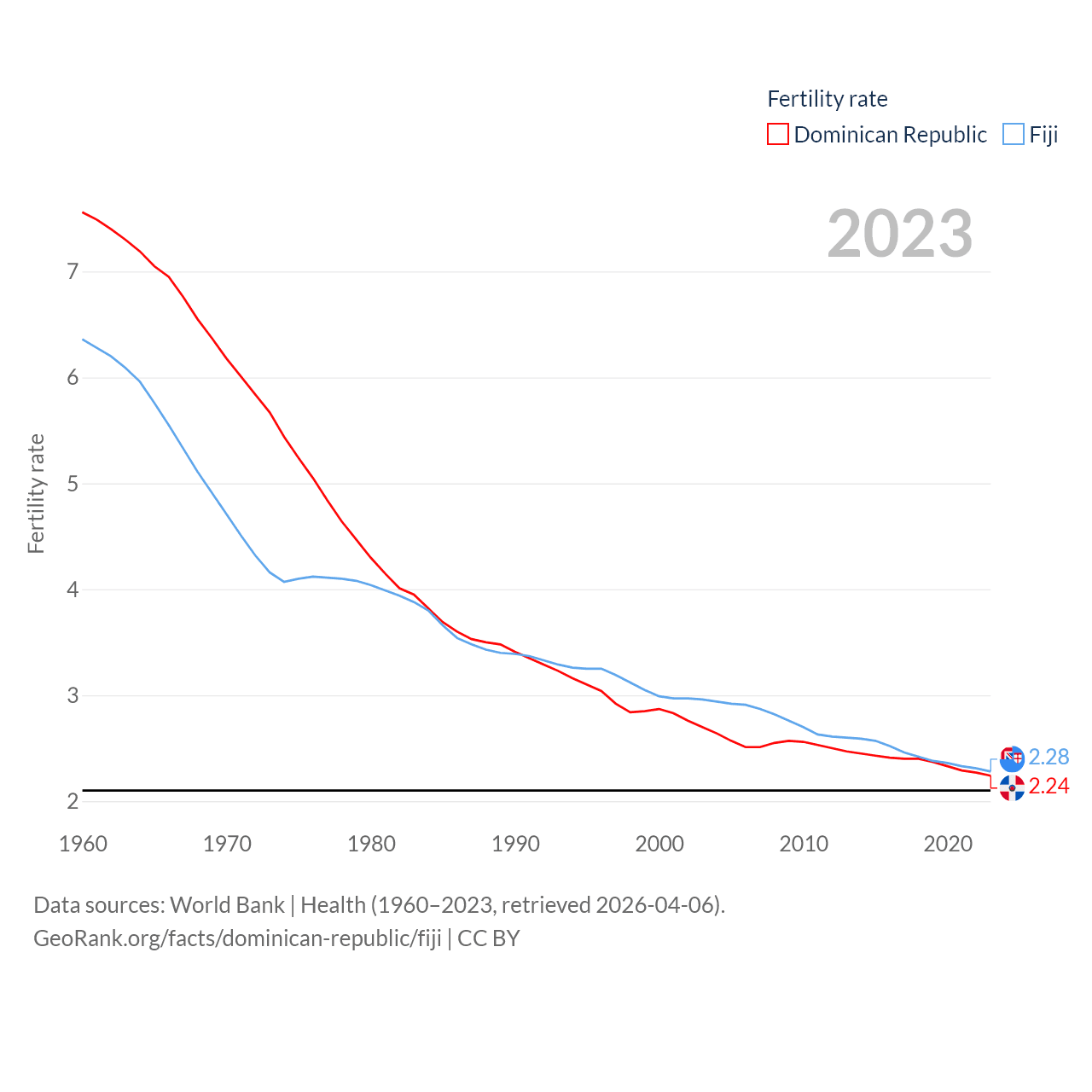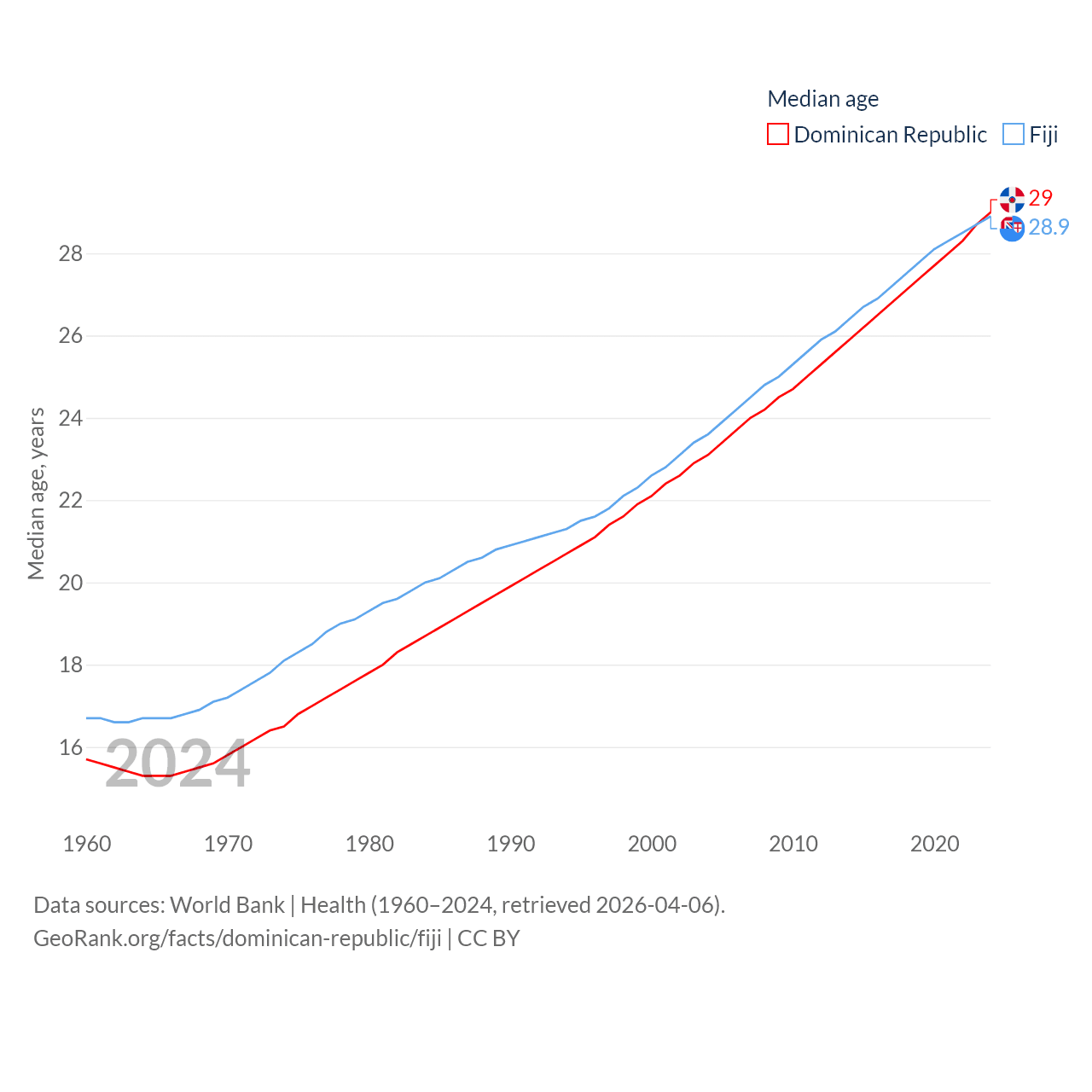 The Dominican Republic has a population of 11.4M (ranked 85/197), compared with 929K in Fiji (ranked 159/197). The Dominican Republic's land area is 18,609 sq mi versus 7,054 sq mi for Fiji (ranked 127th vs. 152nd).
