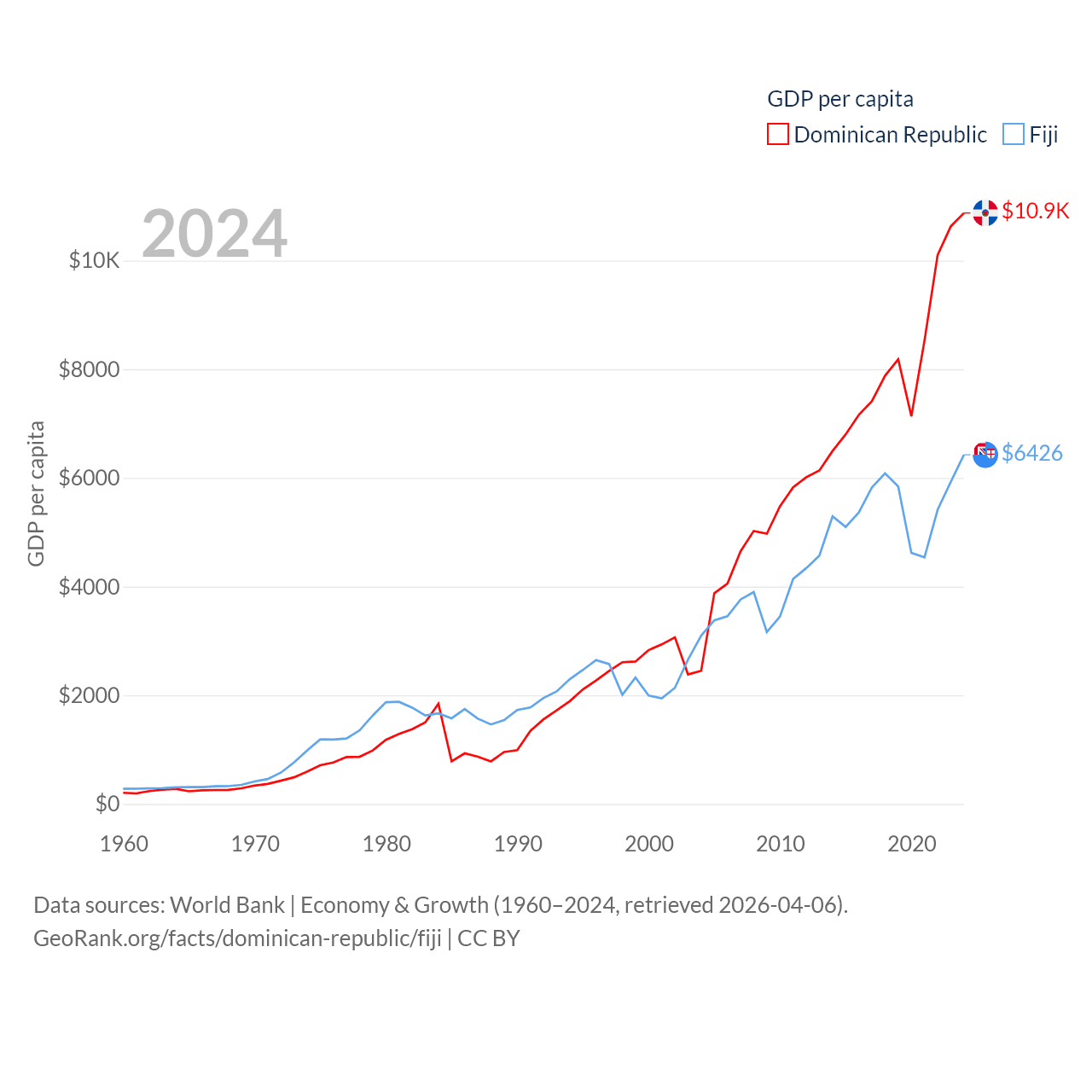 By GDP, The Dominican Republic ranks 63/197 ($124B) and Fiji ranks 161/197 ($5.97B). By GDP per capita, The Dominican Republic ranks 83/197 ($10,876), while Fiji ranks 108/197 ($6,426).