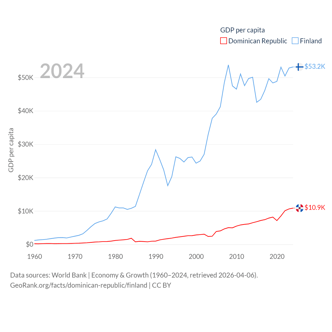 By GDP, The Dominican Republic ranks 63/197 ($124B) and Finland ranks 47/197 ($299B). By GDP per capita, The Dominican Republic ranks 83/197 ($10,876), while Finland ranks 23/197 ($53,150).