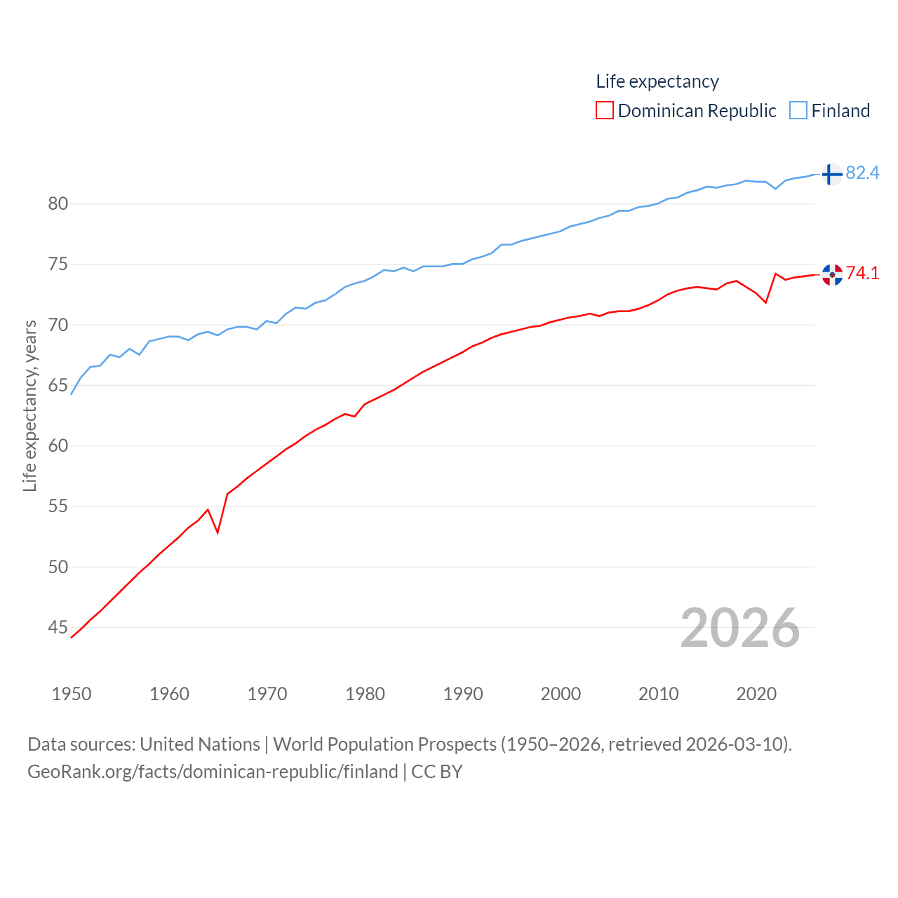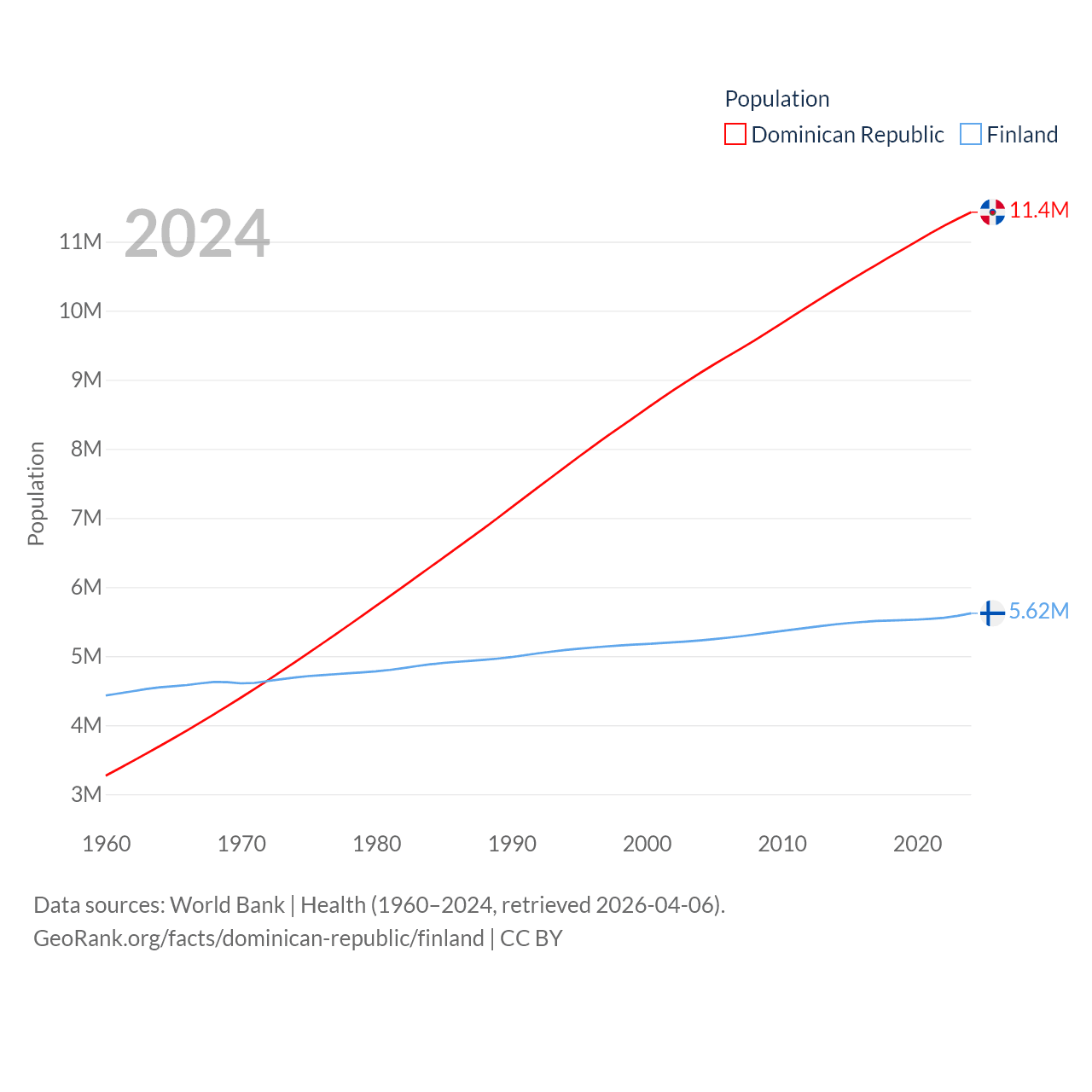 The Dominican Republic has a population of 11.4M (ranked 85/197), compared with 5.62M in Finland (ranked 116/197). The Dominican Republic's land area is 18,609 sq mi versus 117,360 sq mi for Finland (ranked 127th vs. 70th).