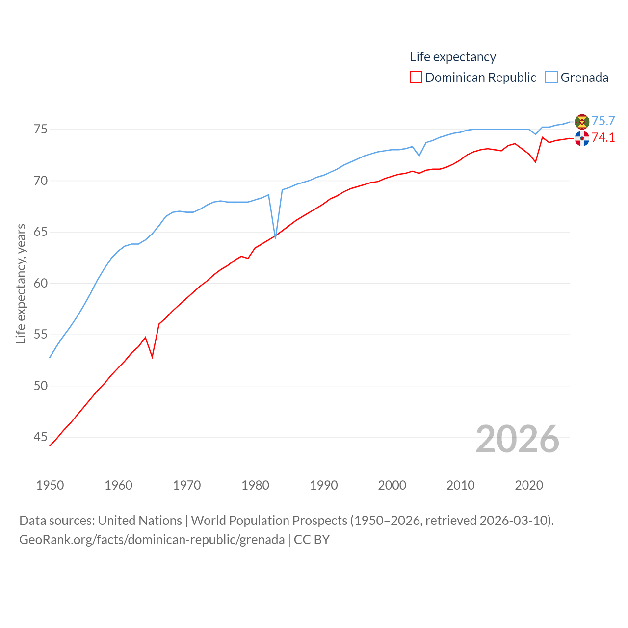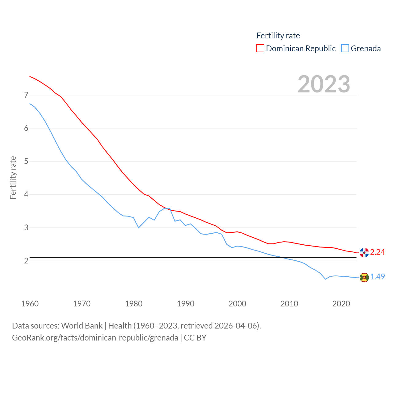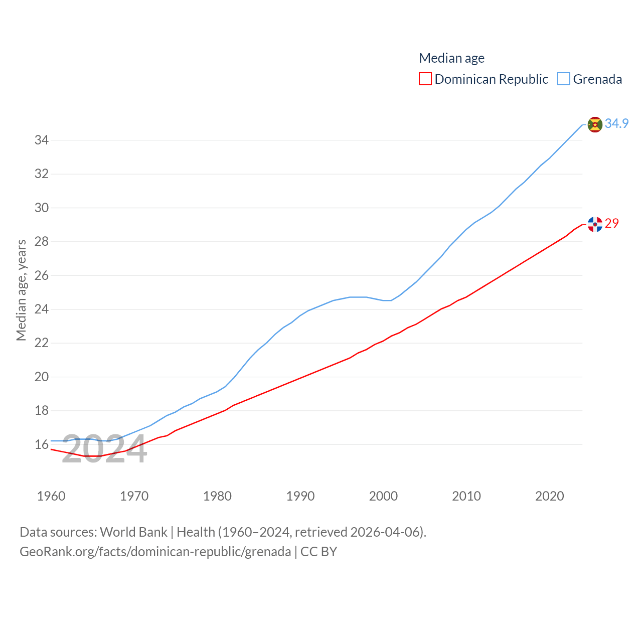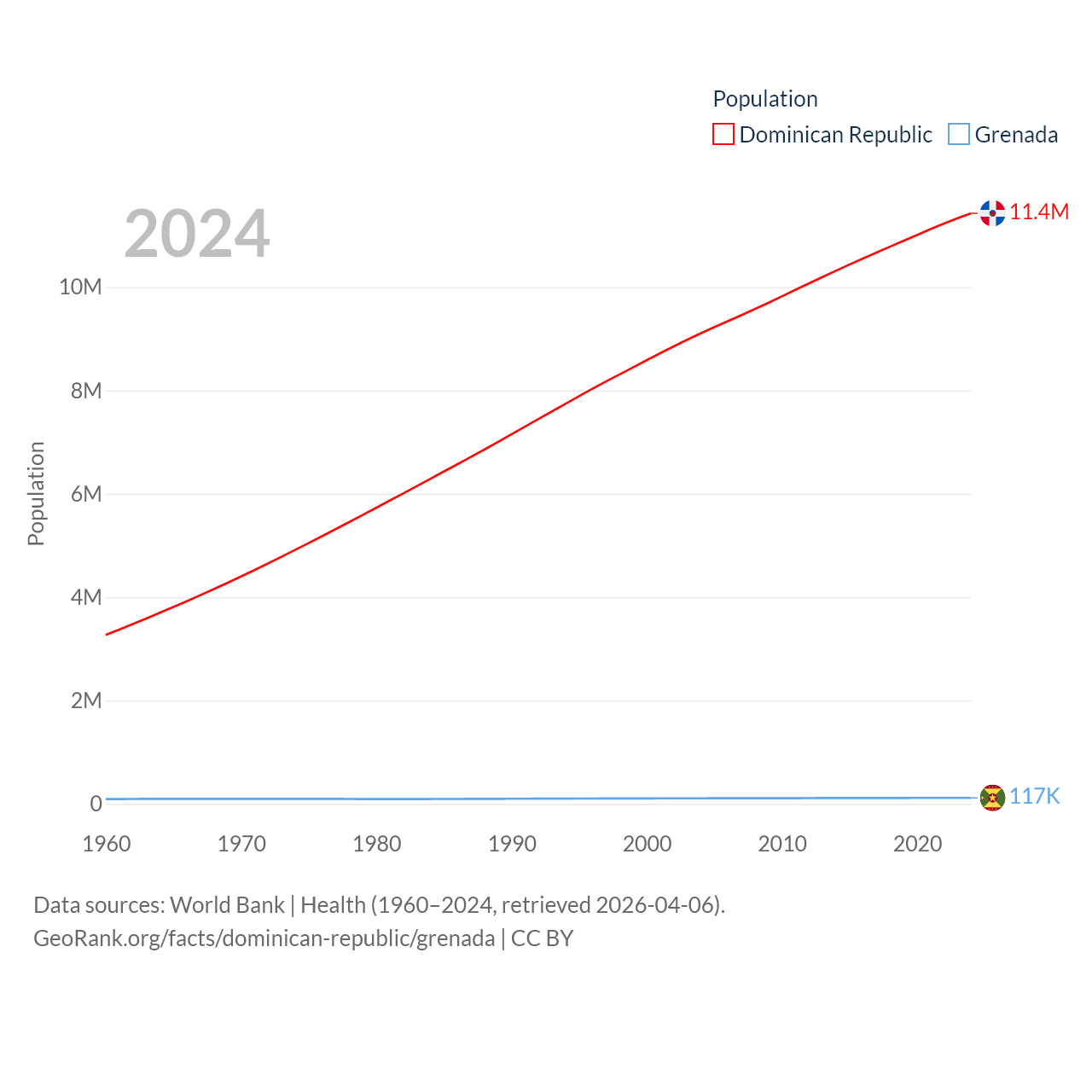 The Dominican Republic has a population of 11.4M (ranked 85/197), compared with 117K in Grenada (ranked 182/197). The Dominican Republic's land area is 18,609 sq mi versus 131.3 sq mi for Grenada (ranked 127th vs. 186th).