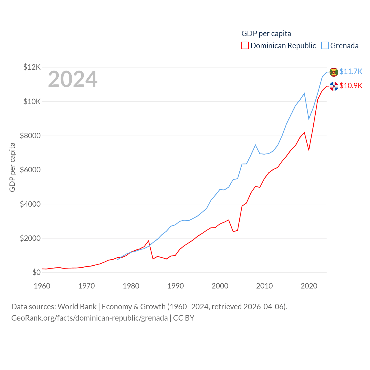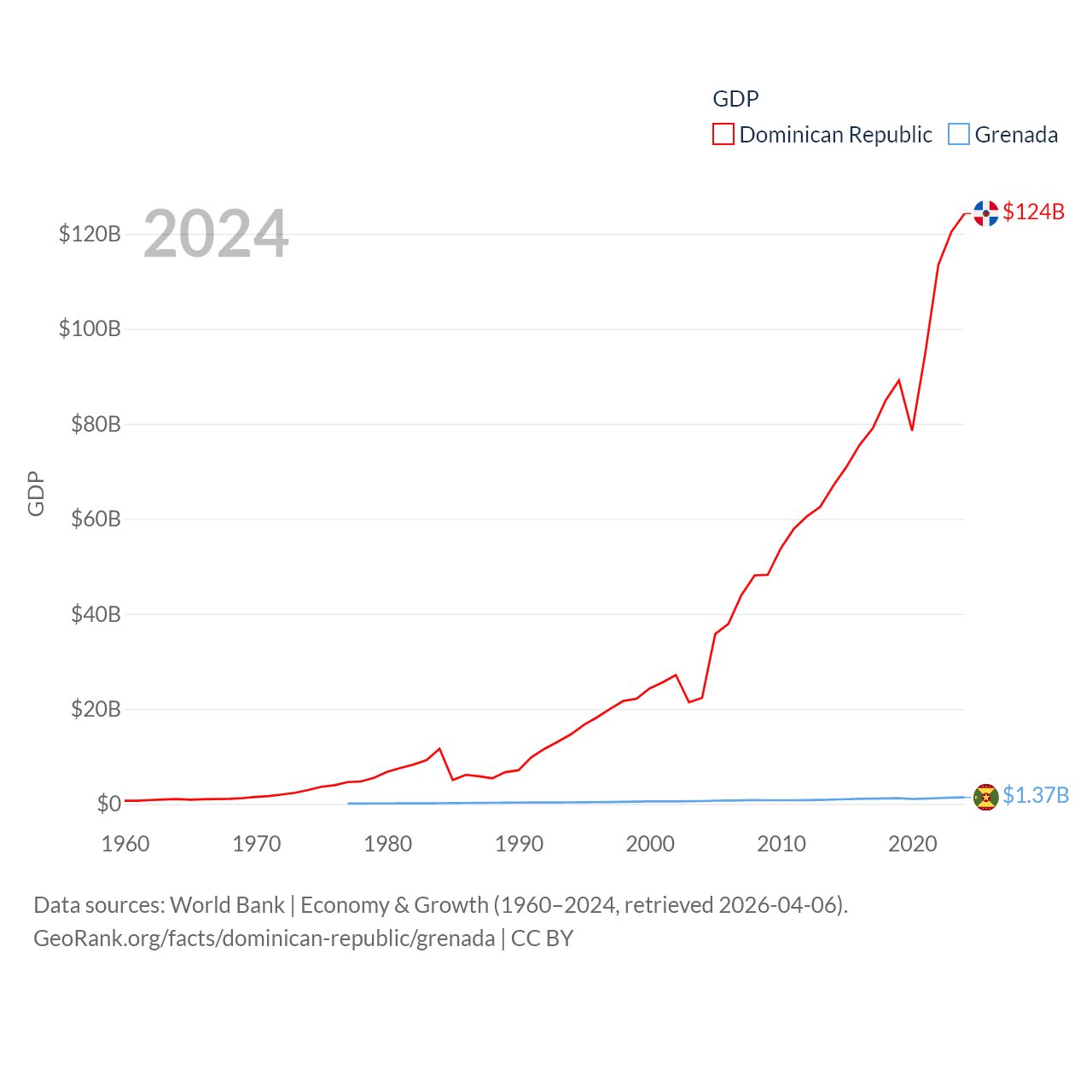 By GDP, The Dominican Republic ranks 63/197 ($124B) and Grenada ranks 184/197 ($1.37B). By GDP per capita, The Dominican Republic ranks 83/197 ($10,876), while Grenada ranks 80/197 ($11,705).