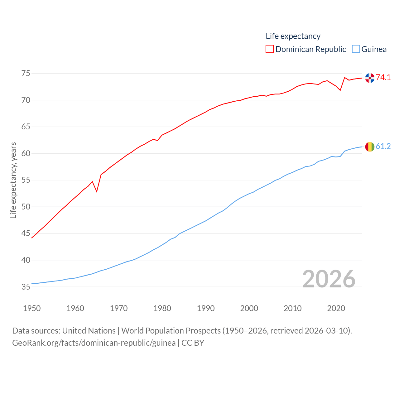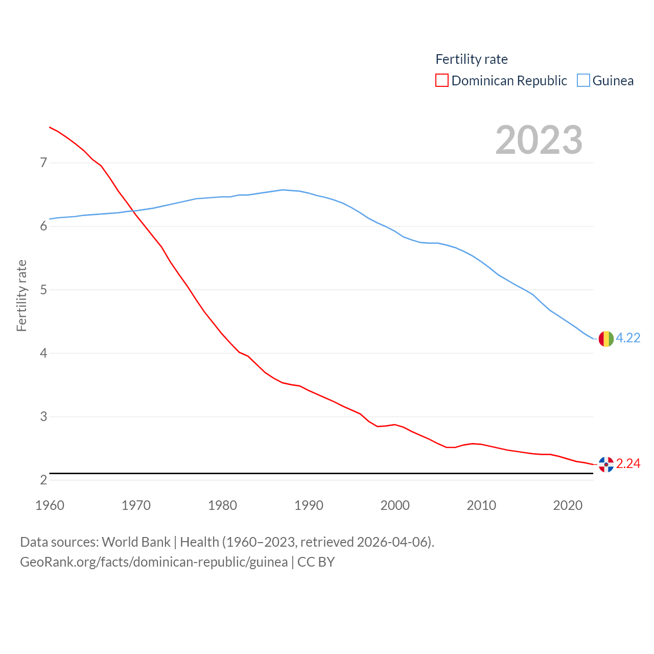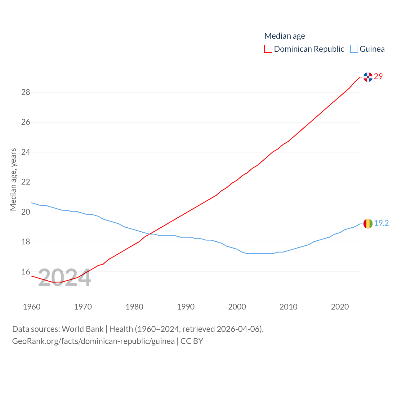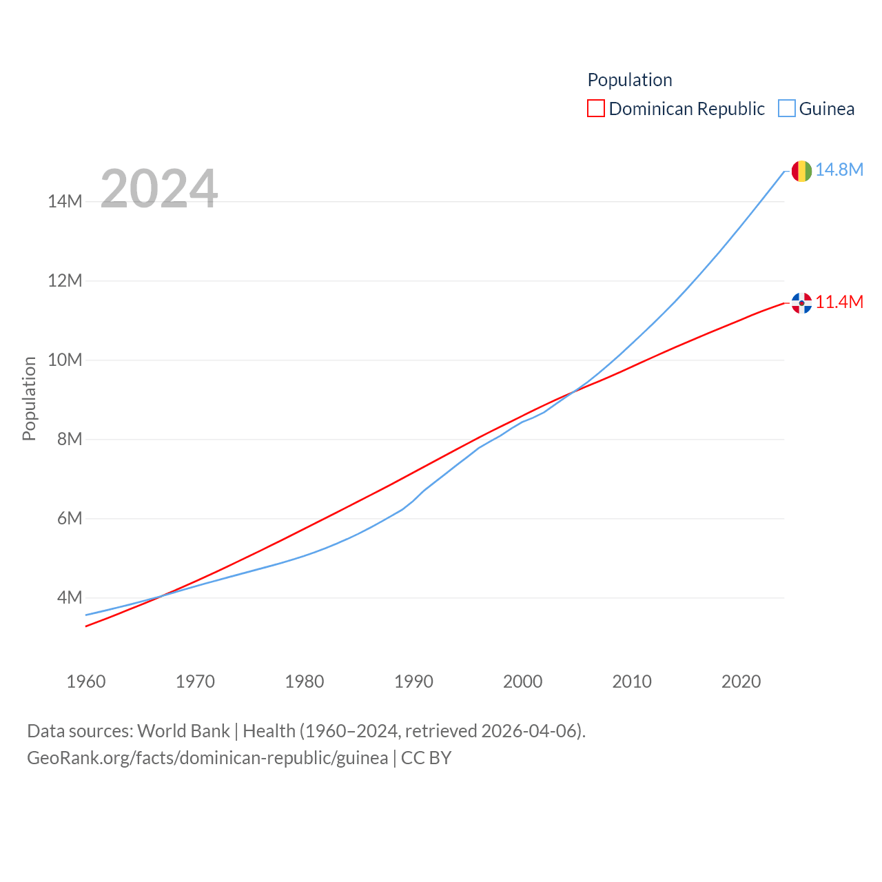 The Dominican Republic has a population of 11.4M (ranked 85/197), compared with 14.8M in Guinea (ranked 75/197). The Dominican Republic's land area is 18,609 sq mi versus 94,873 sq mi for Guinea (ranked 127th vs. 77th).