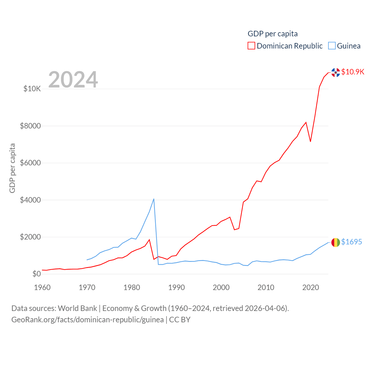 By GDP, The Dominican Republic ranks 63/197 ($124B) and Guinea ranks 118/197 ($25B). By GDP per capita, The Dominican Republic ranks 83/197 ($10,876), while Guinea ranks 160/197 ($1,695).
