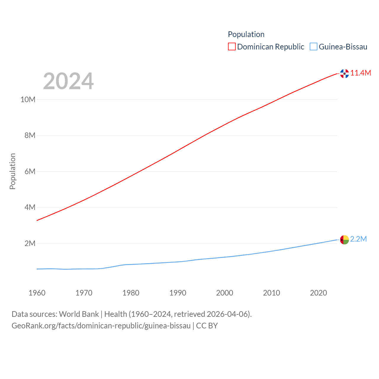 The Dominican Republic has a population of 11.4M (ranked 85/197), compared with 2.2M in Guinea-Bissau (ranked 146/197). The Dominican Republic's land area is 18,609 sq mi versus 10,857 sq mi for Guinea-Bissau (ranked 127th vs. 139th).