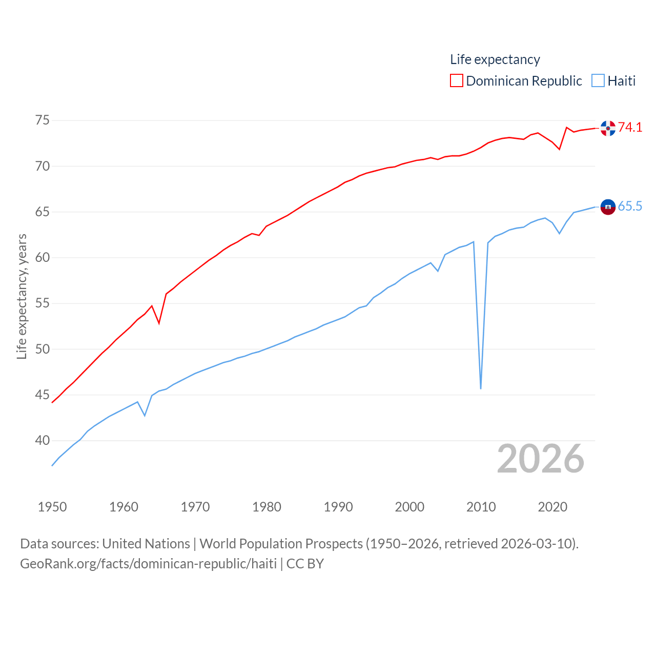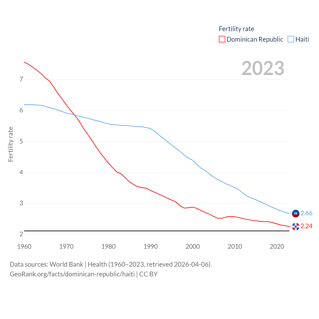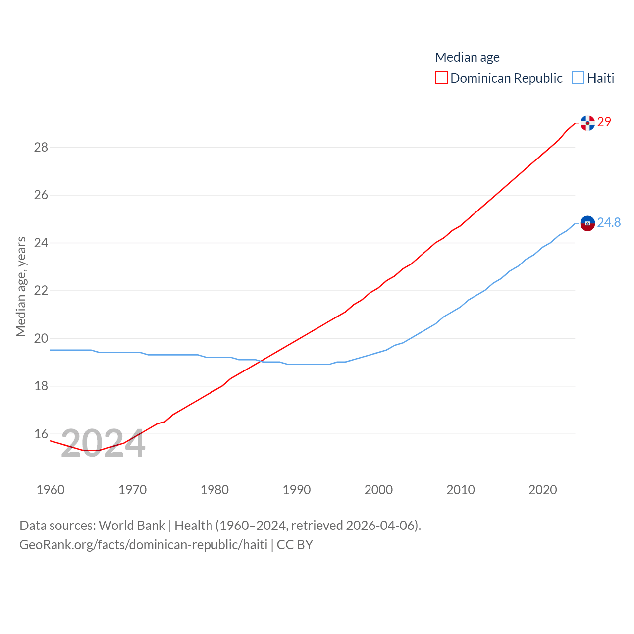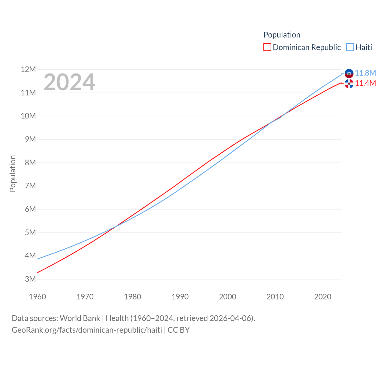 The Dominican Republic has a population of 11.4M (ranked 85/197), compared with 11.8M in Haiti (ranked 83/197). The Dominican Republic's land area is 18,609 sq mi versus 10,641 sq mi for Haiti (ranked 127th vs. 142nd).