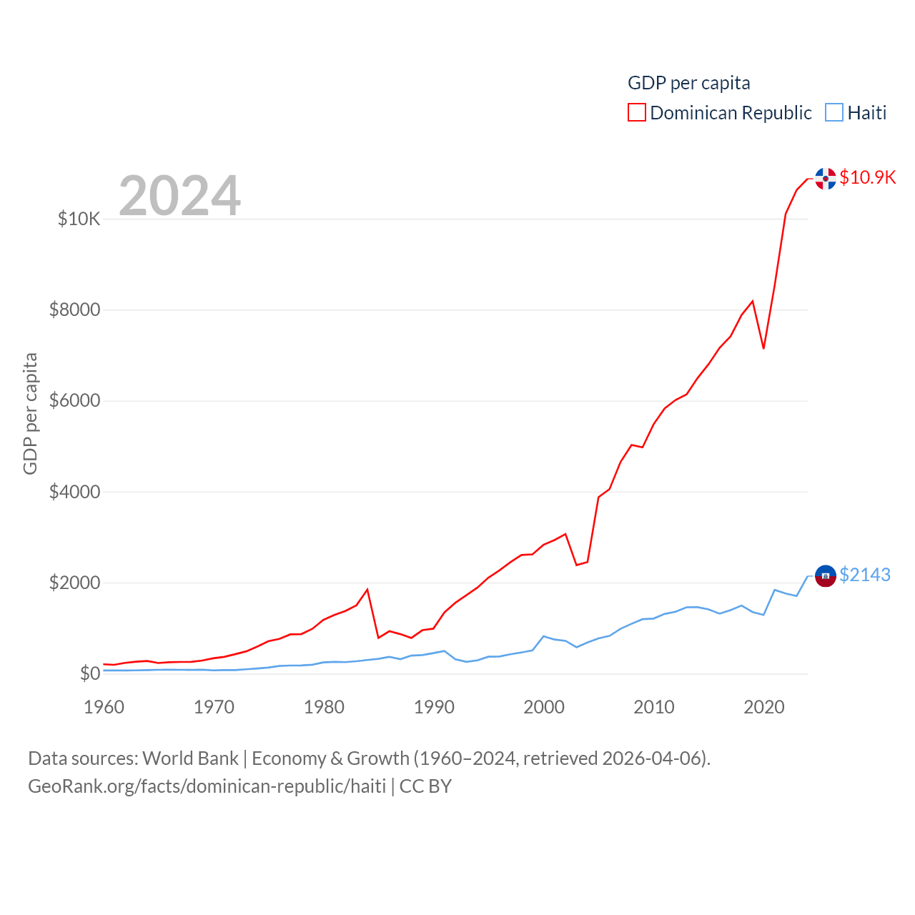 By GDP, The Dominican Republic ranks 63/197 ($124B) and Haiti ranks 117/197 ($25.2B). By GDP per capita, The Dominican Republic ranks 83/197 ($10,876), while Haiti ranks 153/197 ($2,143).