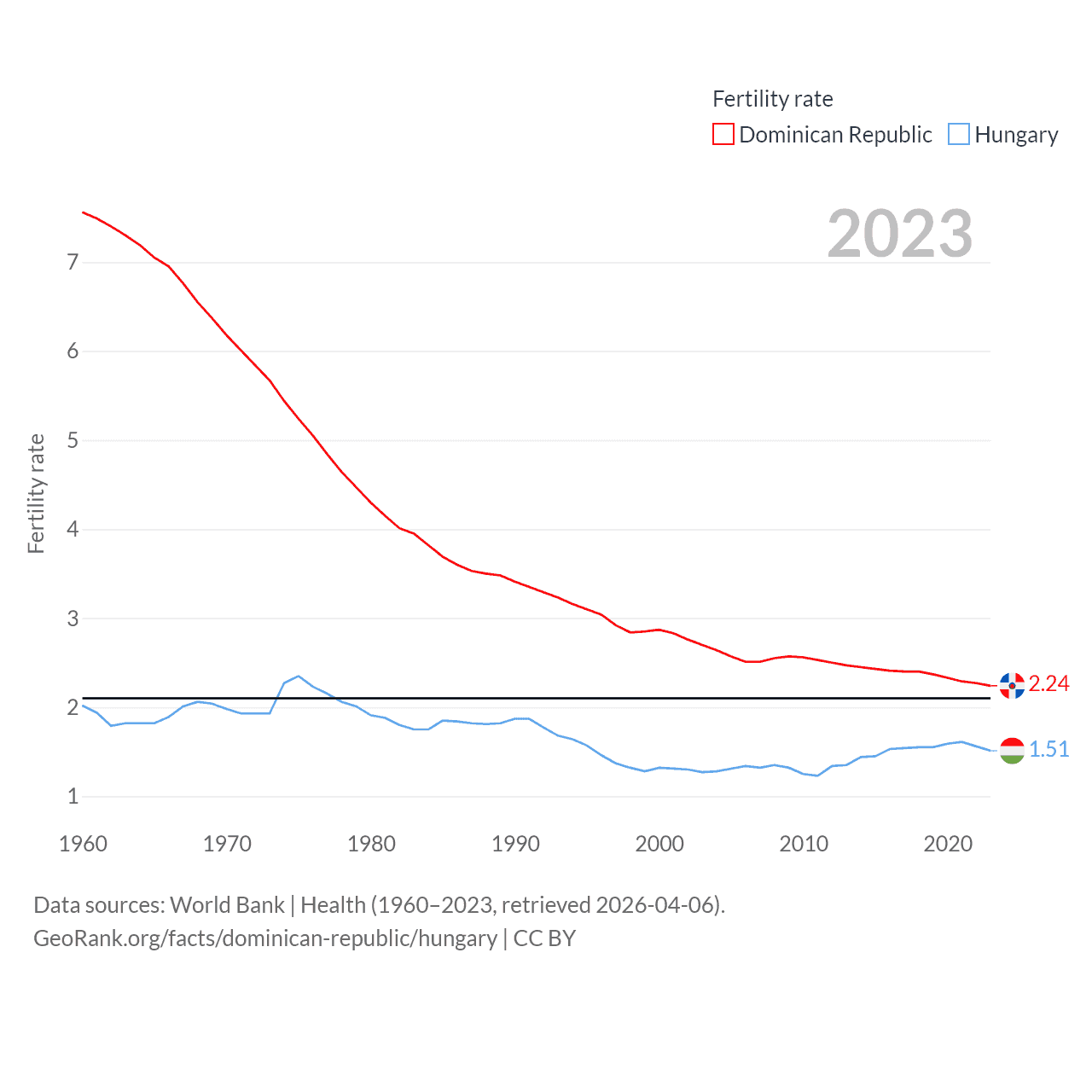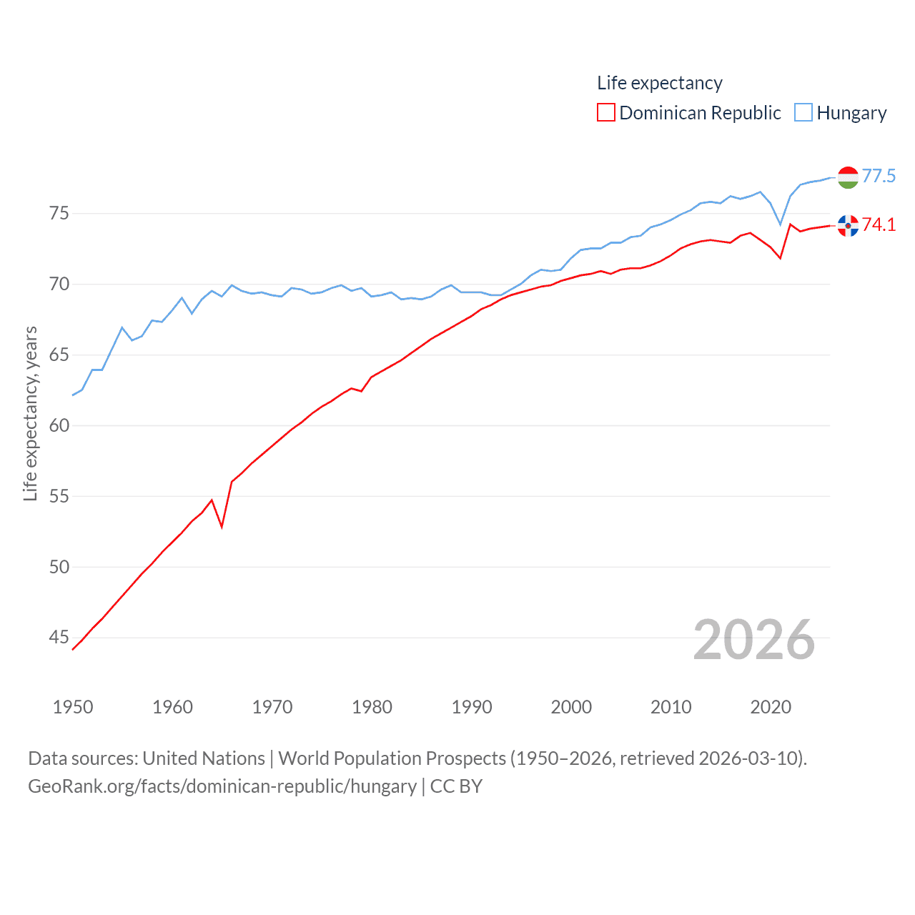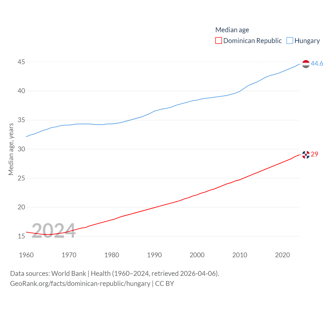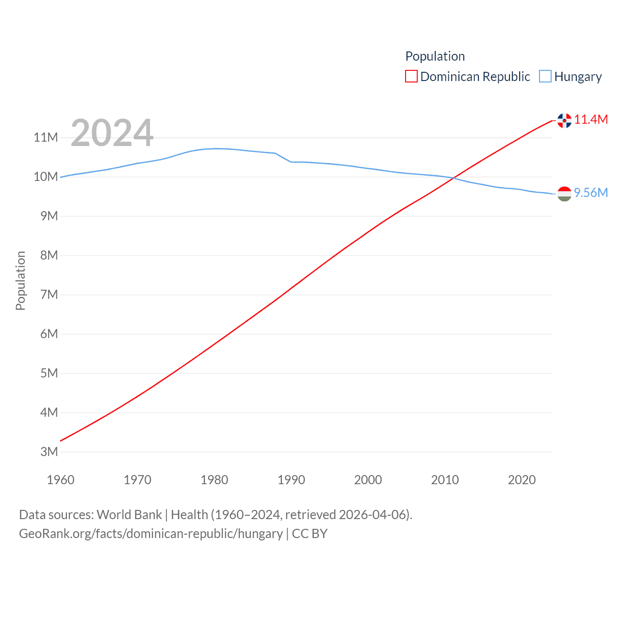 The Dominican Republic has a population of 11.4M (ranked 85/197), compared with 9.56M in Hungary (ranked 97/197). The Dominican Republic's land area is 18,609 sq mi versus 35,236 sq mi for Hungary (ranked 127th vs. 109th).