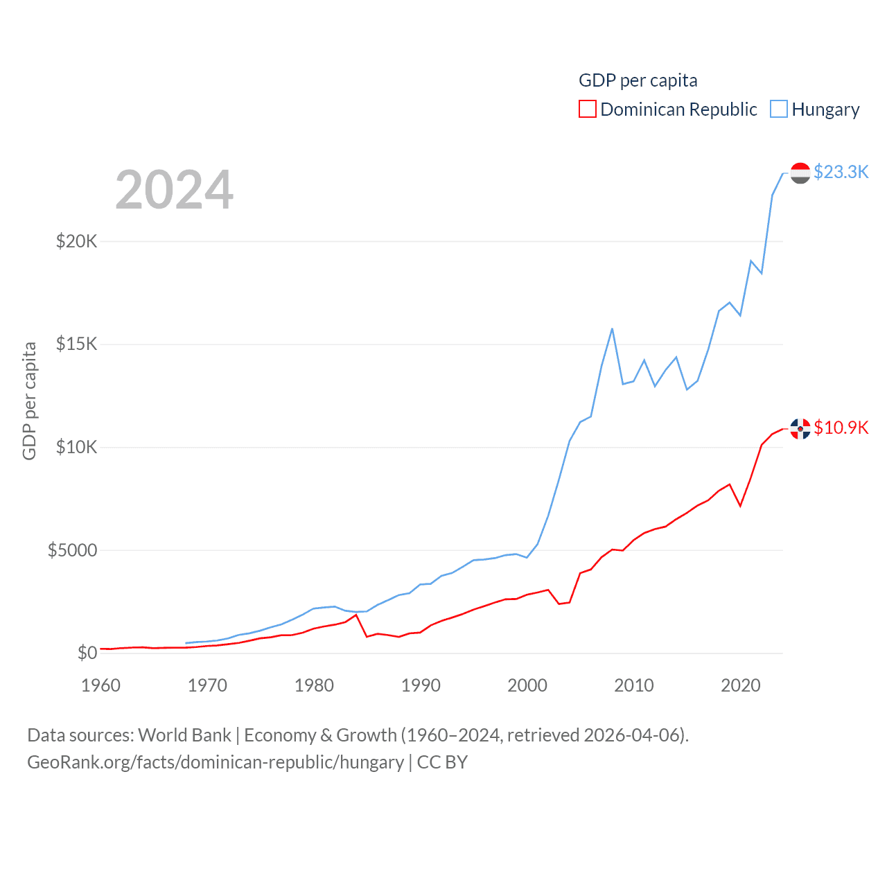 By GDP, The Dominican Republic ranks 63/197 ($124B) and Hungary ranks 55/197 ($223B). By GDP per capita, The Dominican Republic ranks 83/197 ($10,876), while Hungary ranks 55/197 ($23,292).