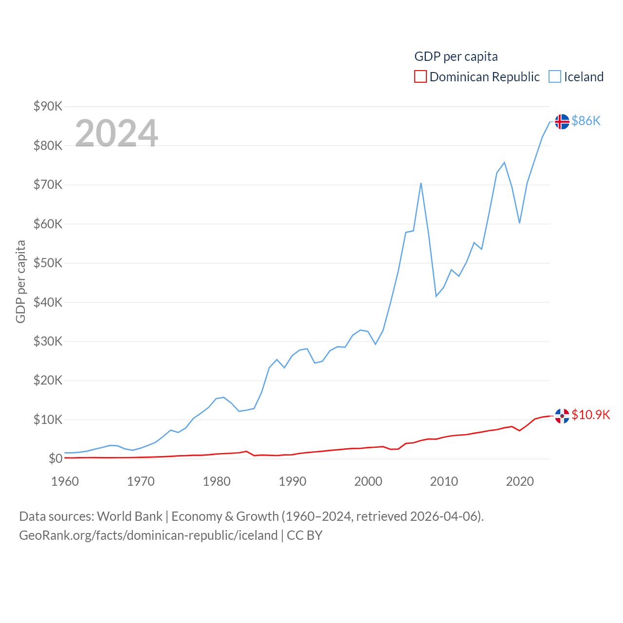 By GDP, The Dominican Republic ranks 63/197 ($124B) and Iceland ranks 108/197 ($33.3B). By GDP per capita, The Dominican Republic ranks 83/197 ($10,876), while Iceland ranks 9/197 ($86,041).