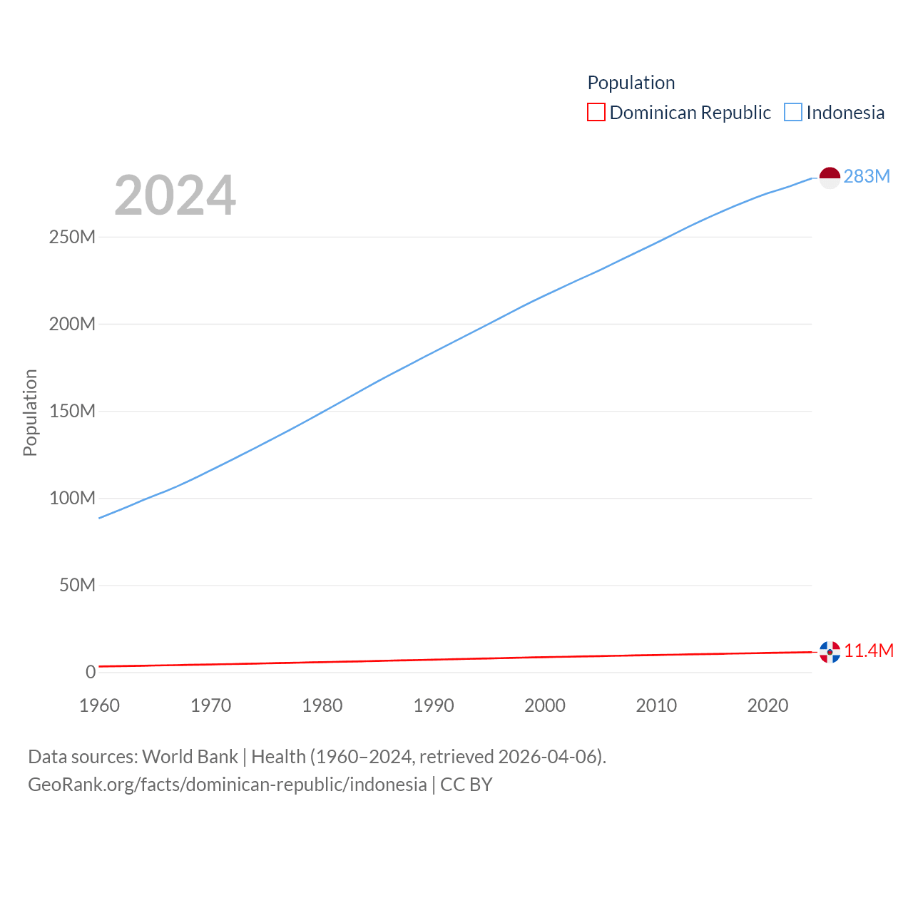The Dominican Republic has a population of 11.4M (ranked 85/197), compared with 283M in Indonesia (ranked 4/197). The Dominican Republic's land area is 18,609 sq mi versus 730,720 sq mi for Indonesia (ranked 127th vs. 14th).