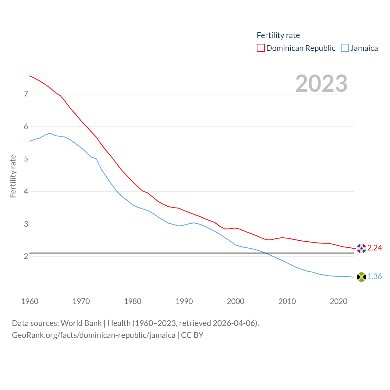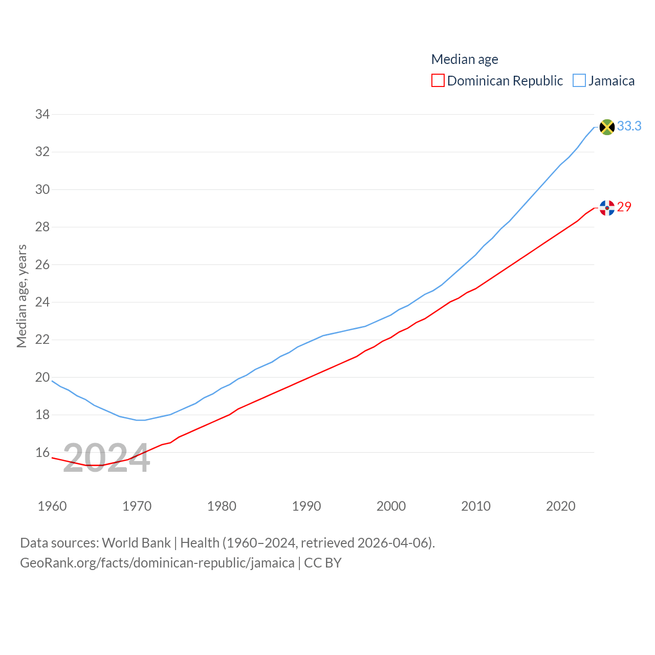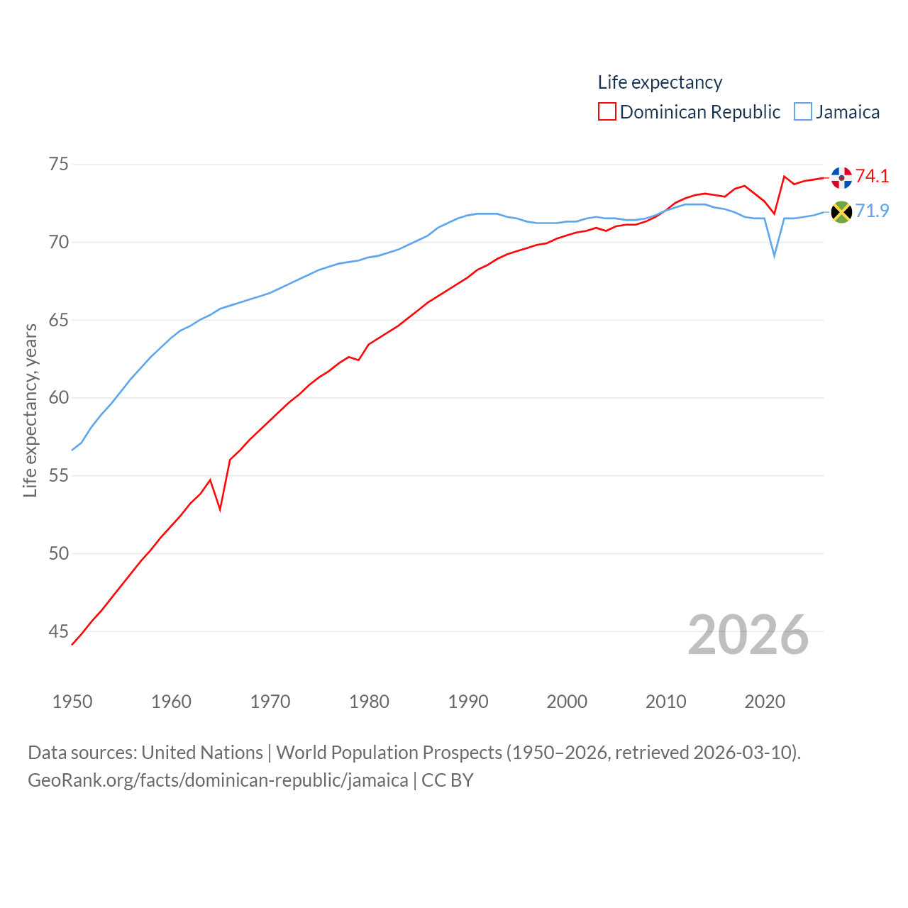 The Dominican Republic has a population of 11.4M (ranked 85/197), compared with 2.84M in Jamaica (ranked 139/197). The Dominican Republic's land area is 18,609 sq mi versus 4,181 sq mi for Jamaica (ranked 127th vs. 159th).