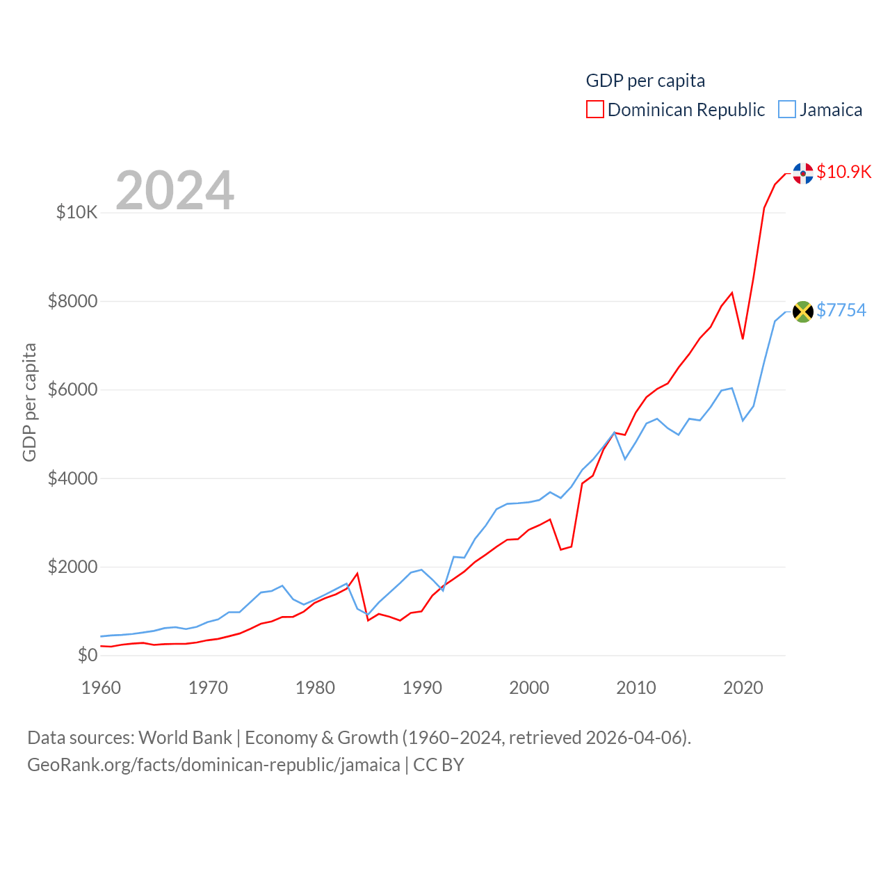 By GDP, The Dominican Republic ranks 63/197 ($124B) and Jamaica ranks 124/197 ($22B). By GDP per capita, The Dominican Republic ranks 83/197 ($10,876), while Jamaica ranks 95/197 ($7,754).