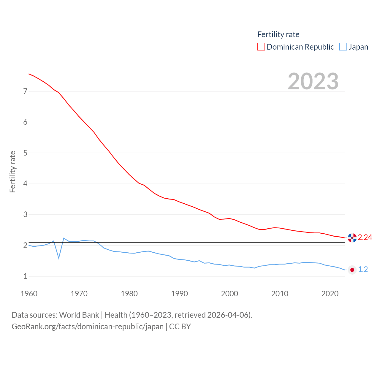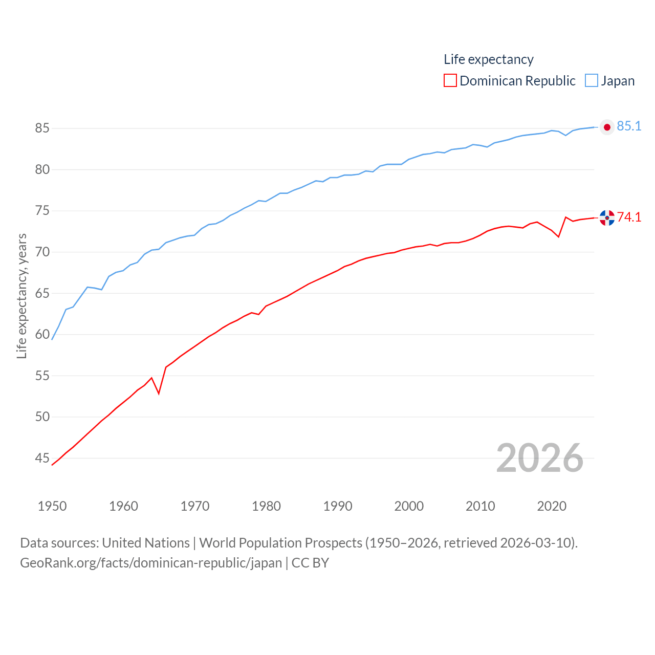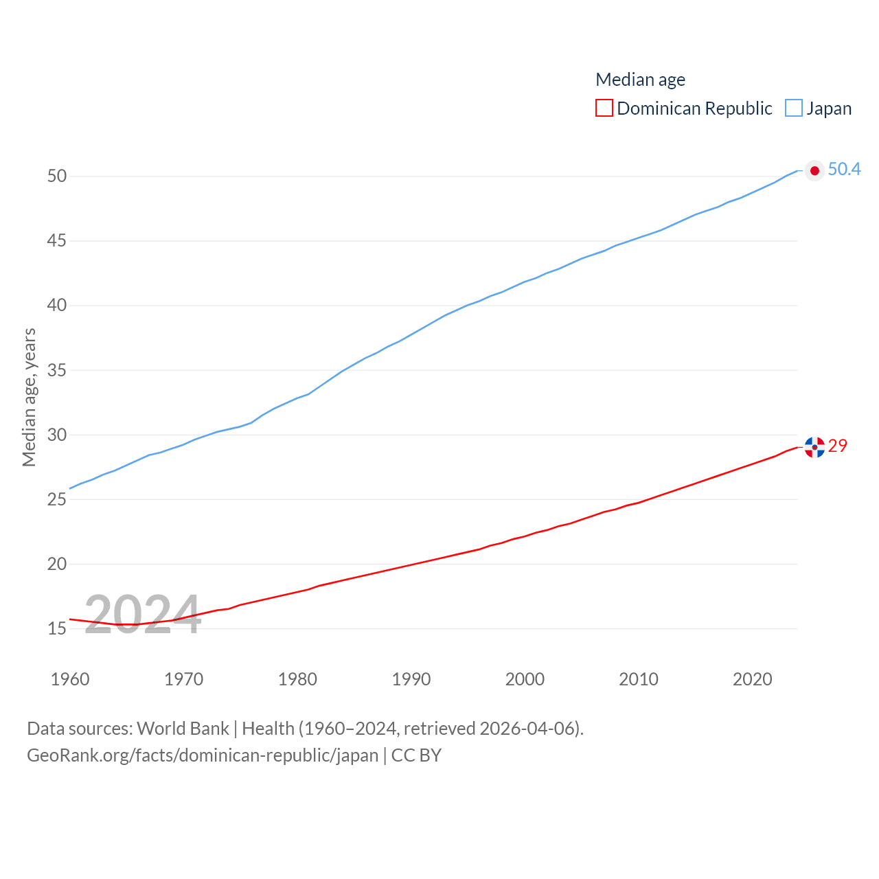 The Dominican Republic has a population of 11.4M (ranked 85/197), compared with 124M in Japan (ranked 12/197). The Dominican Republic's land area is 18,609 sq mi versus 140,761 sq mi for Japan (ranked 127th vs. 61st).