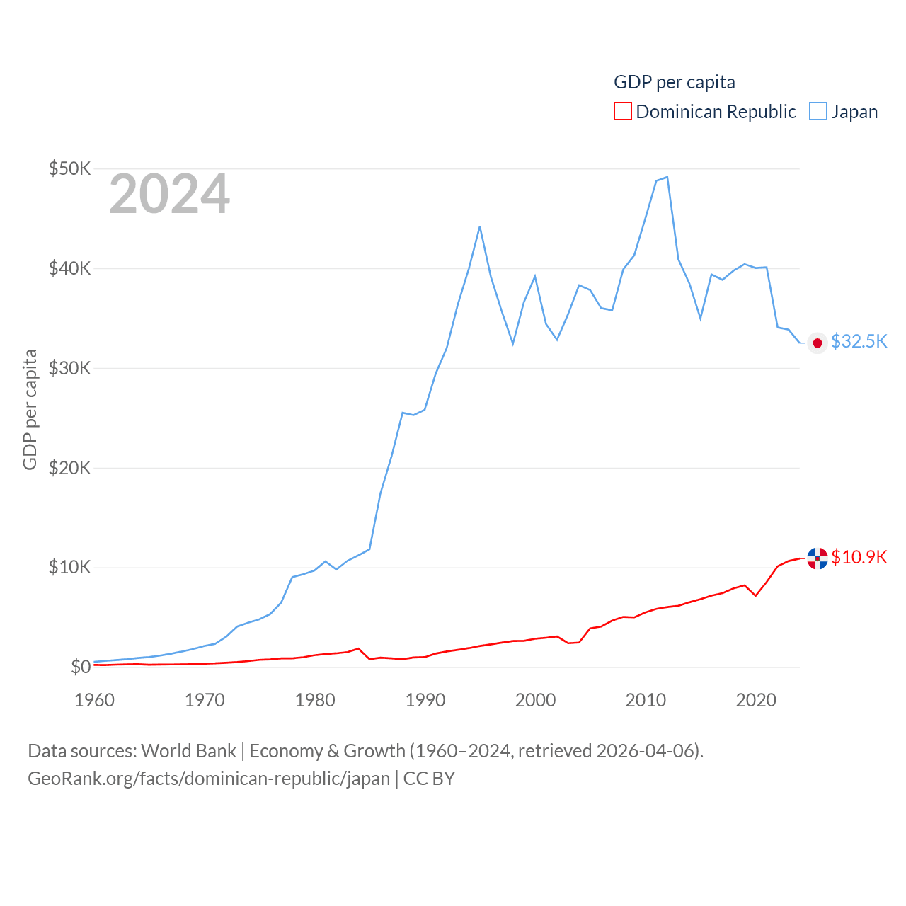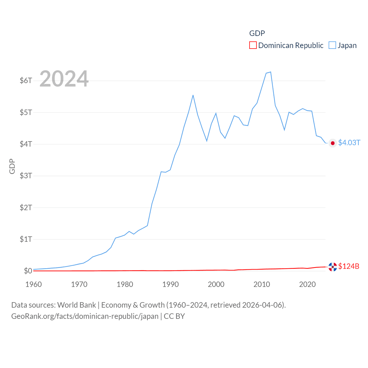 By GDP, The Dominican Republic ranks 63/197 ($124B) and Japan ranks 4/197 ($4.03T). By GDP per capita, The Dominican Republic ranks 83/197 ($10,876), while Japan ranks 38/197 ($32,487).