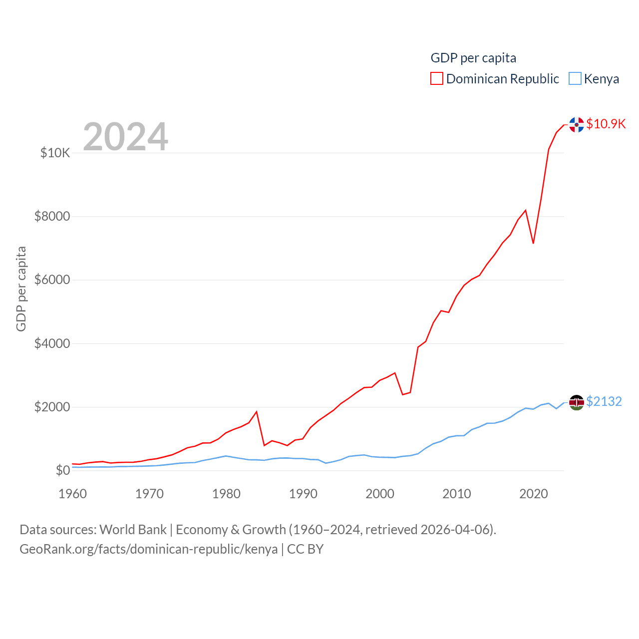 By GDP, The Dominican Republic ranks 63/197 ($124B) and Kenya ranks 64/197 ($120B). By GDP per capita, The Dominican Republic ranks 83/197 ($10,876), while Kenya ranks 154/197 ($2,132).