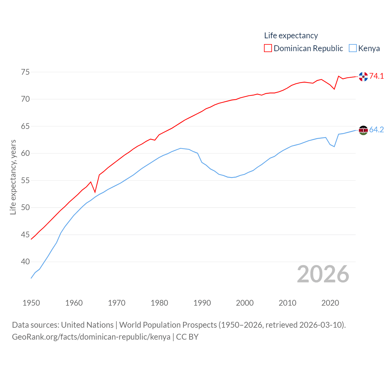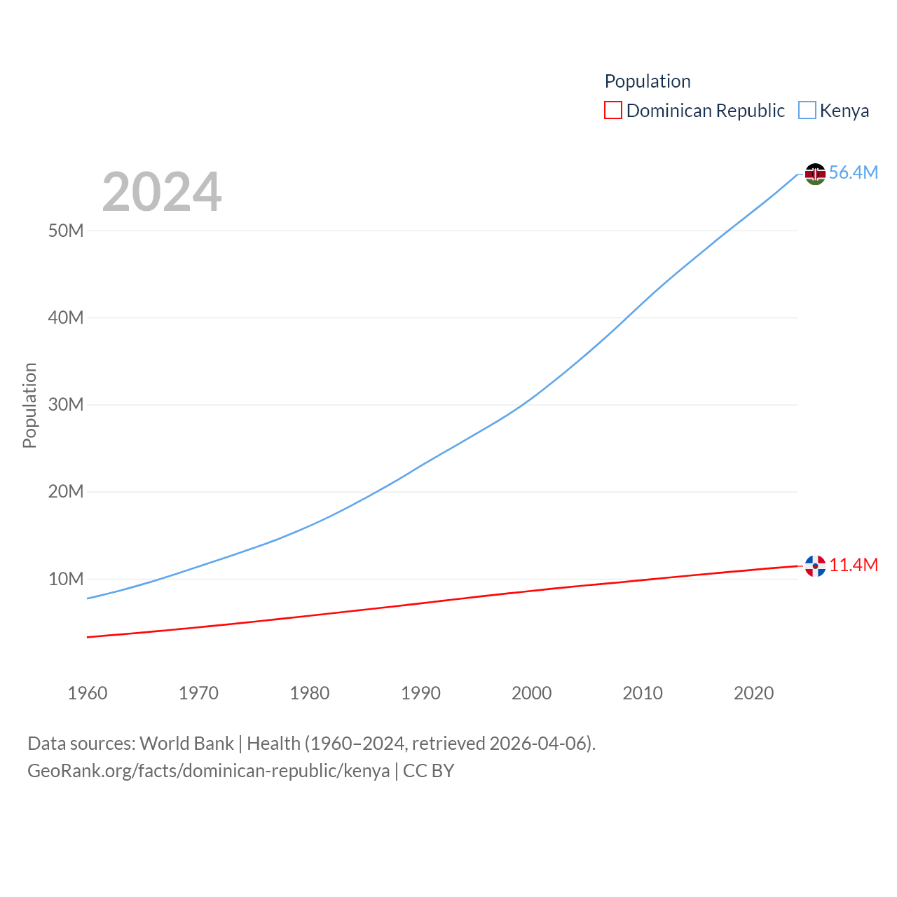 The Dominican Republic has a population of 11.4M (ranked 85/197), compared with 56.4M in Kenya (ranked 26/197). The Dominican Republic's land area is 18,609 sq mi versus 224,278 sq mi for Kenya (ranked 127th vs. 45th).