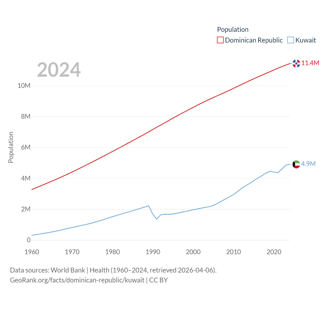 The Dominican Republic has a population of 11.4M (ranked 85/197), compared with 4.9M in Kuwait (ranked 127/197). The Dominican Republic's land area is 18,609 sq mi versus 6,880 sq mi for Kuwait (ranked 127th vs. 153rd).