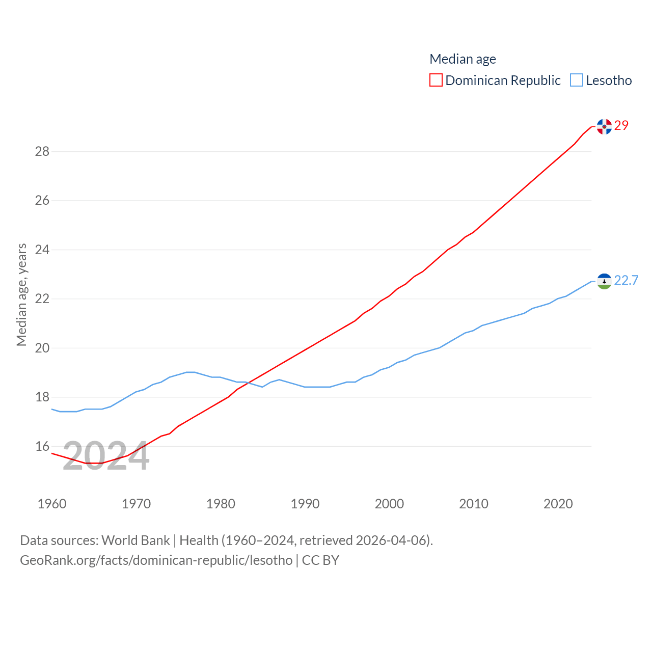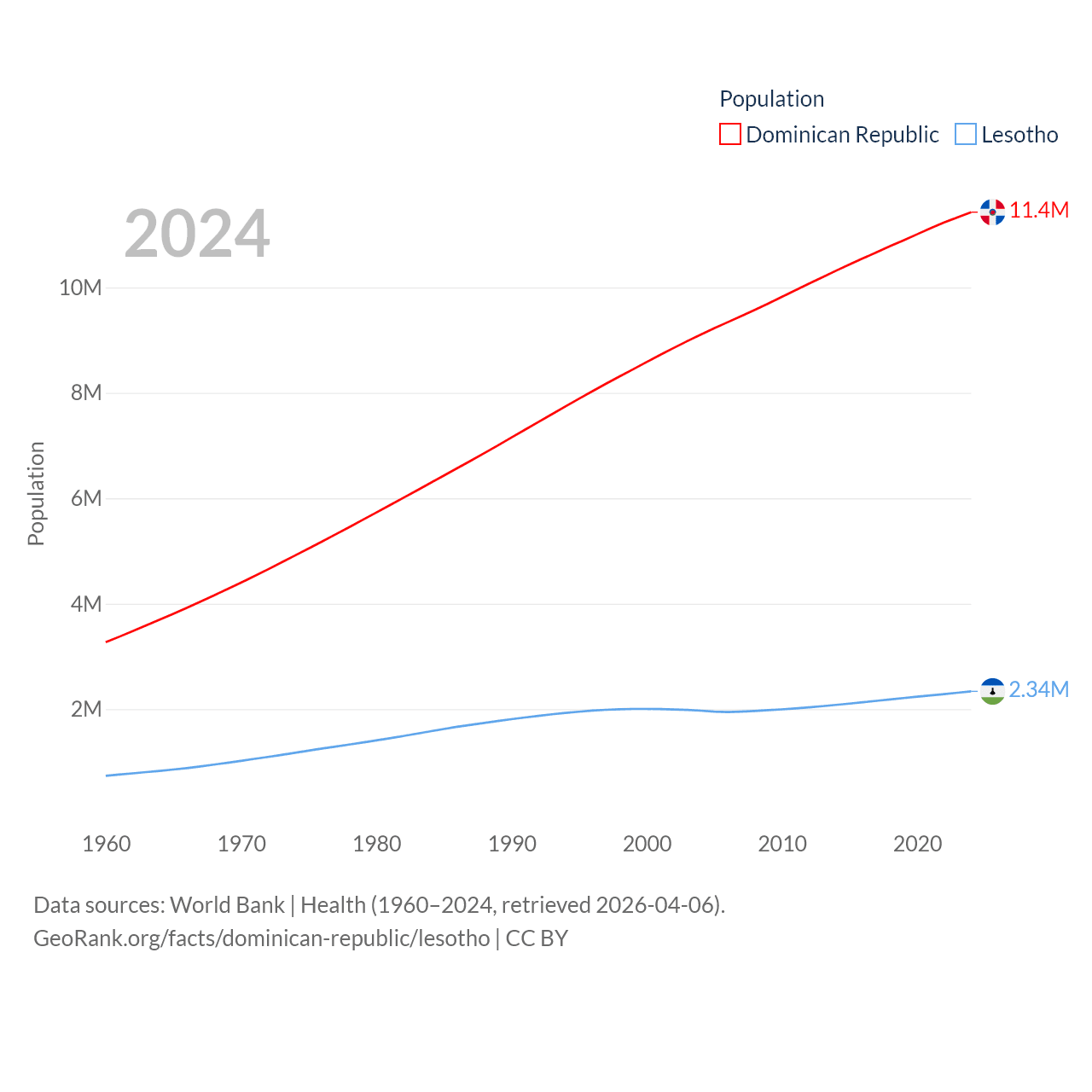 The Dominican Republic has a population of 11.4M (ranked 85/197), compared with 2.34M in Lesotho (ranked 145/197). The Dominican Republic's land area is 18,609 sq mi versus 11,722 sq mi for Lesotho (ranked 127th vs. 137th).