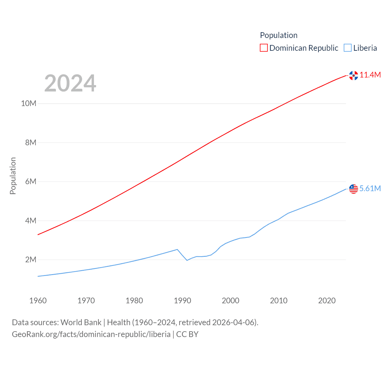The Dominican Republic has a population of 11.4M (ranked 85/197), compared with 5.61M in Liberia (ranked 117/197). The Dominican Republic's land area is 18,609 sq mi versus 37,189 sq mi for Liberia (ranked 127th vs. 106th).