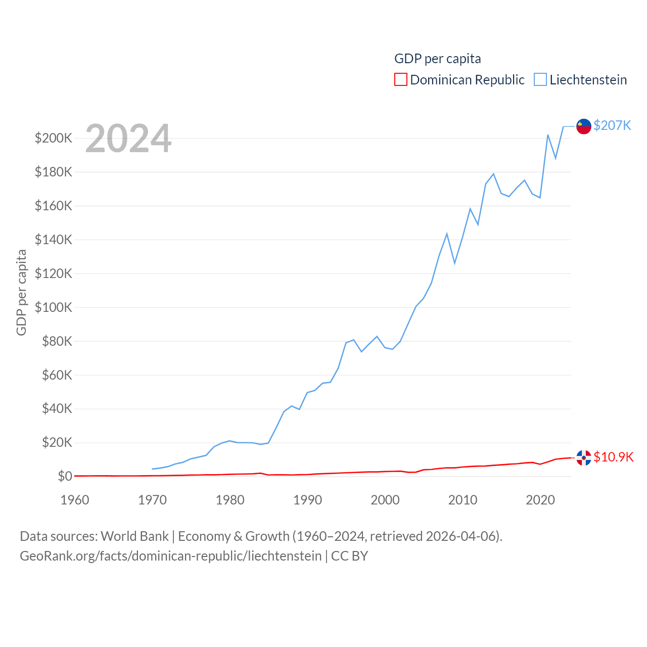 By GDP, The Dominican Republic ranks 63/197 ($124B) and Liechtenstein ranks 156/197 ($8.24B). By GDP per capita, The Dominican Republic ranks 83/197 ($10,876), while Liechtenstein ranks 2/197 ($206,781).