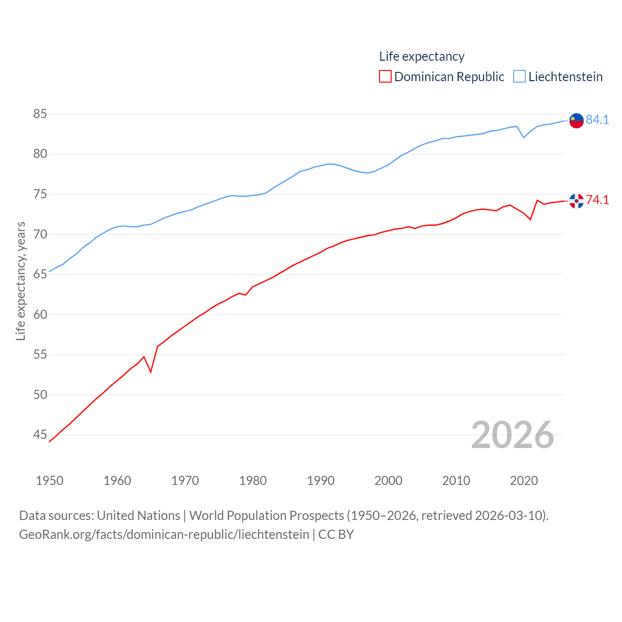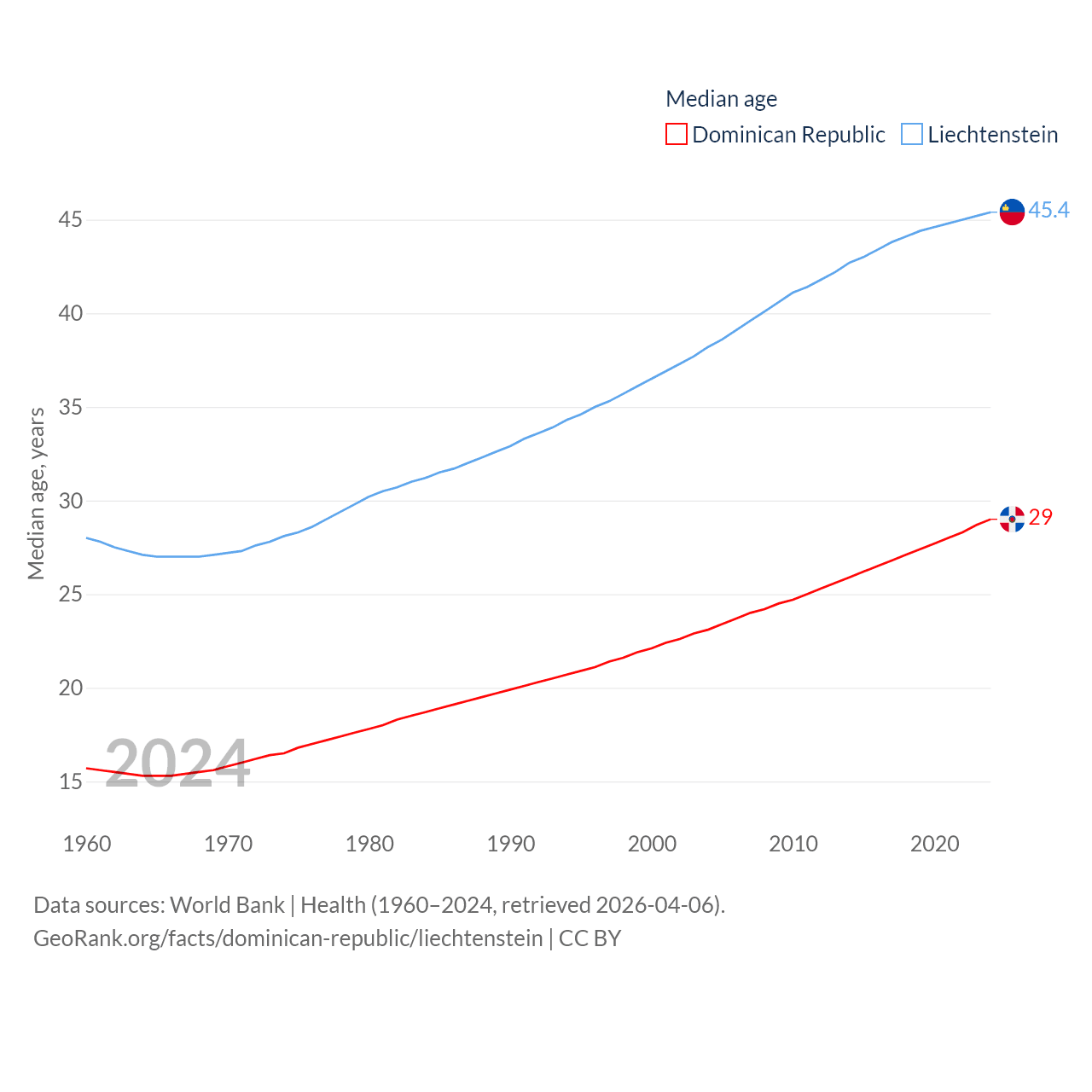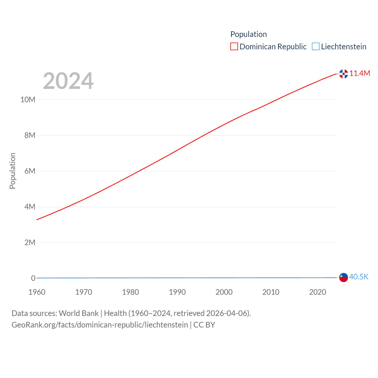 The Dominican Republic has a population of 11.4M (ranked 85/197), compared with 40.4K in Liechtenstein (ranked 190/197). The Dominican Republic's land area is 18,609 sq mi versus 61.8 sq mi for Liechtenstein (ranked 127th vs. 192nd).