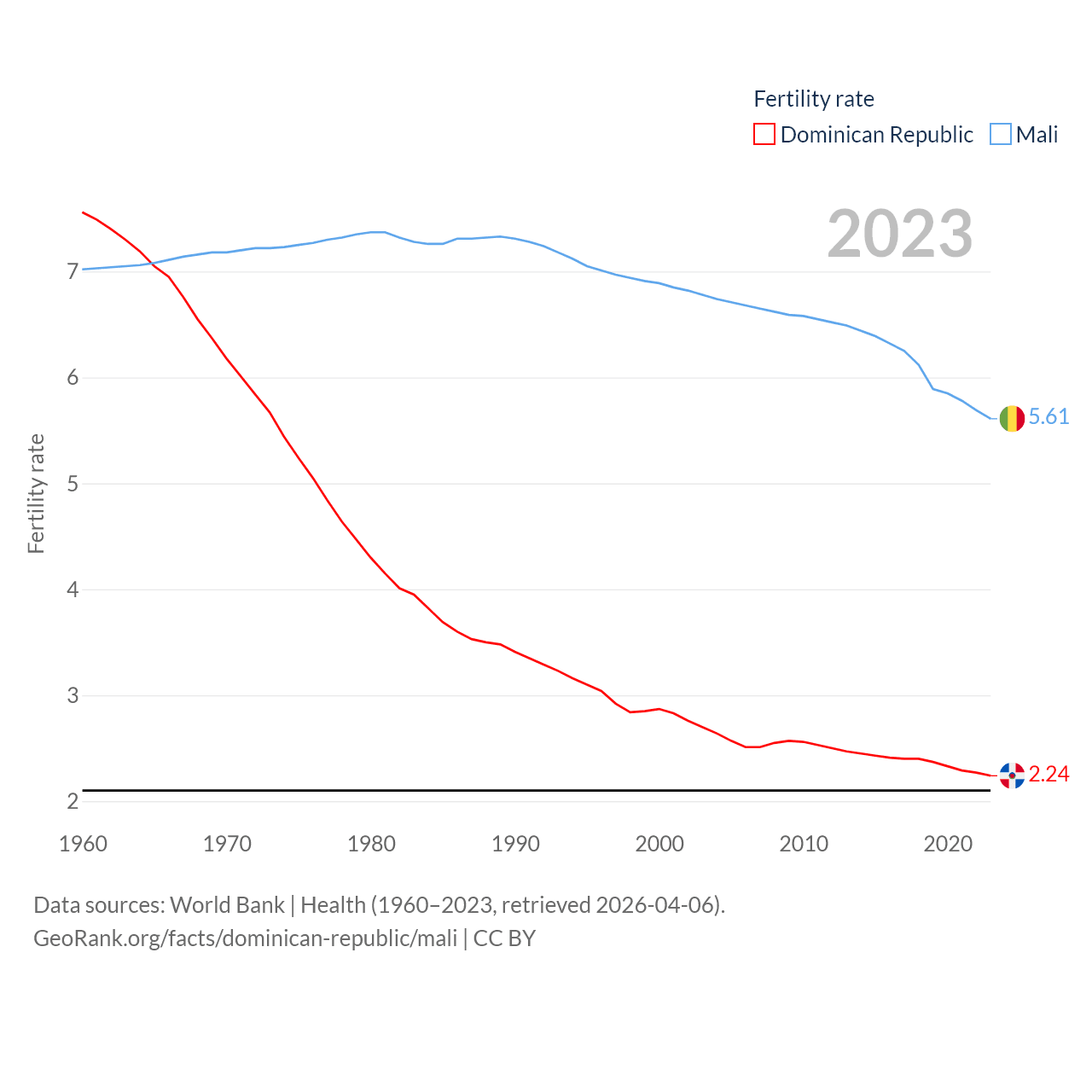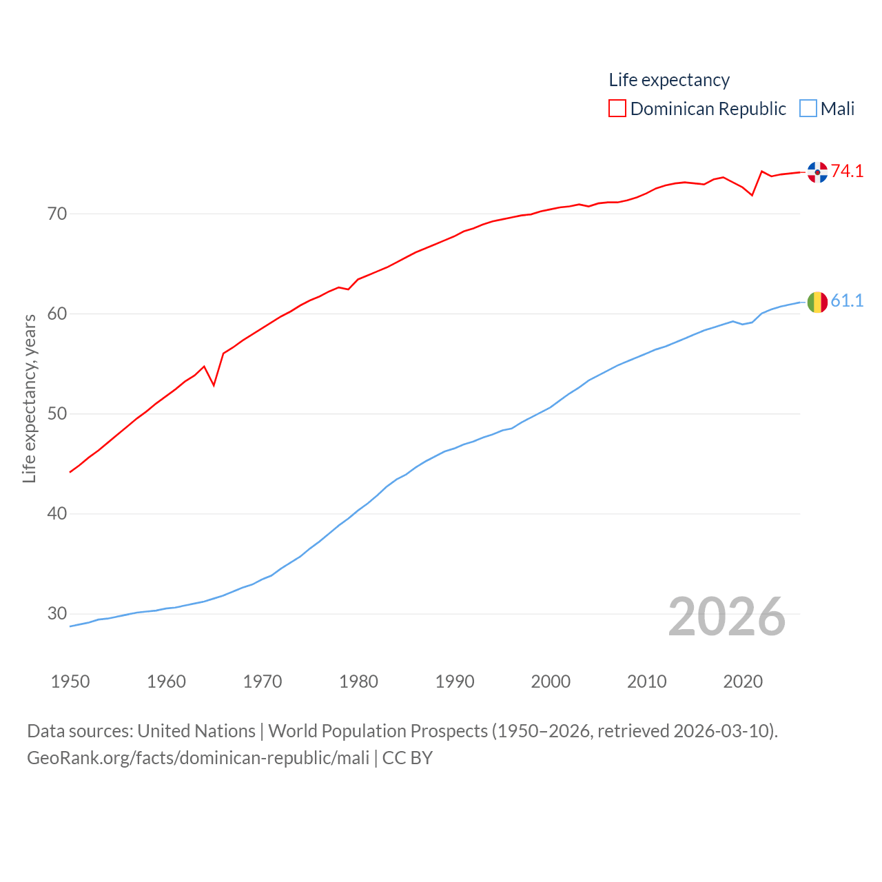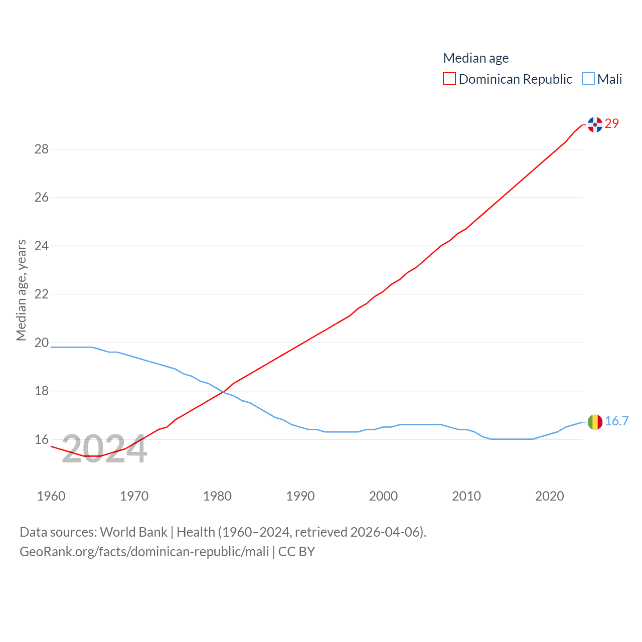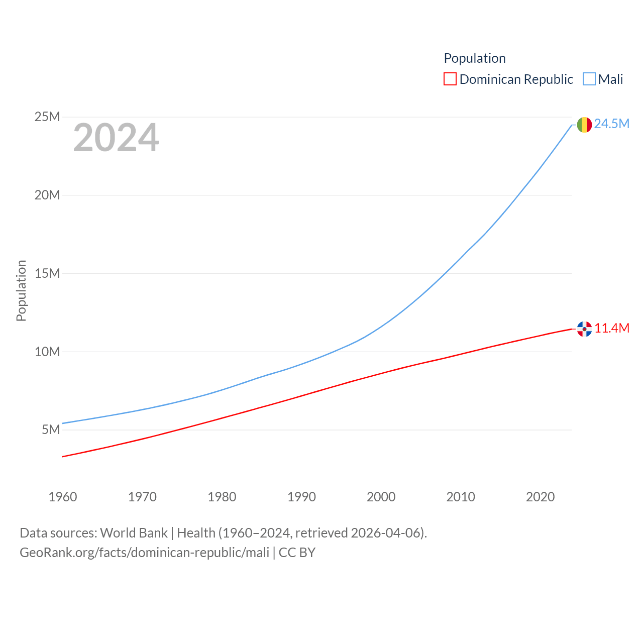 The Dominican Republic has a population of 11.4M (ranked 85/197), compared with 24.5M in Mali (ranked 58/197). The Dominican Republic's land area is 18,609 sq mi versus 471,118 sq mi for Mali (ranked 127th vs. 23rd).