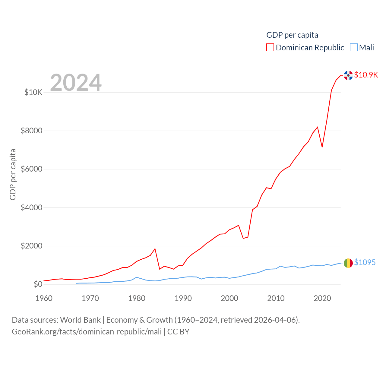 By GDP, The Dominican Republic ranks 63/197 ($124B) and Mali ranks 113/197 ($26.8B). By GDP per capita, The Dominican Republic ranks 83/197 ($10,876), while Mali ranks 173/197 ($1,095).