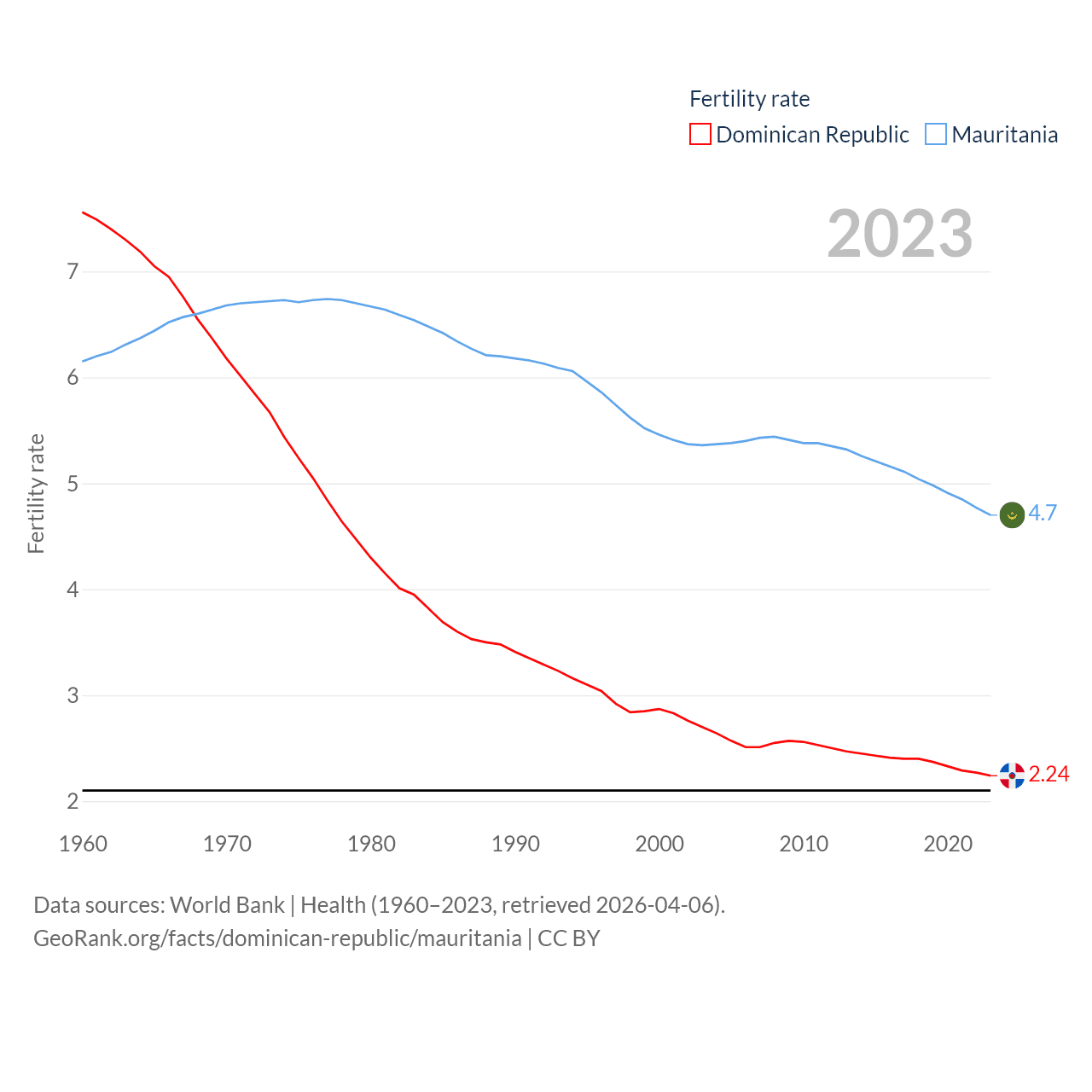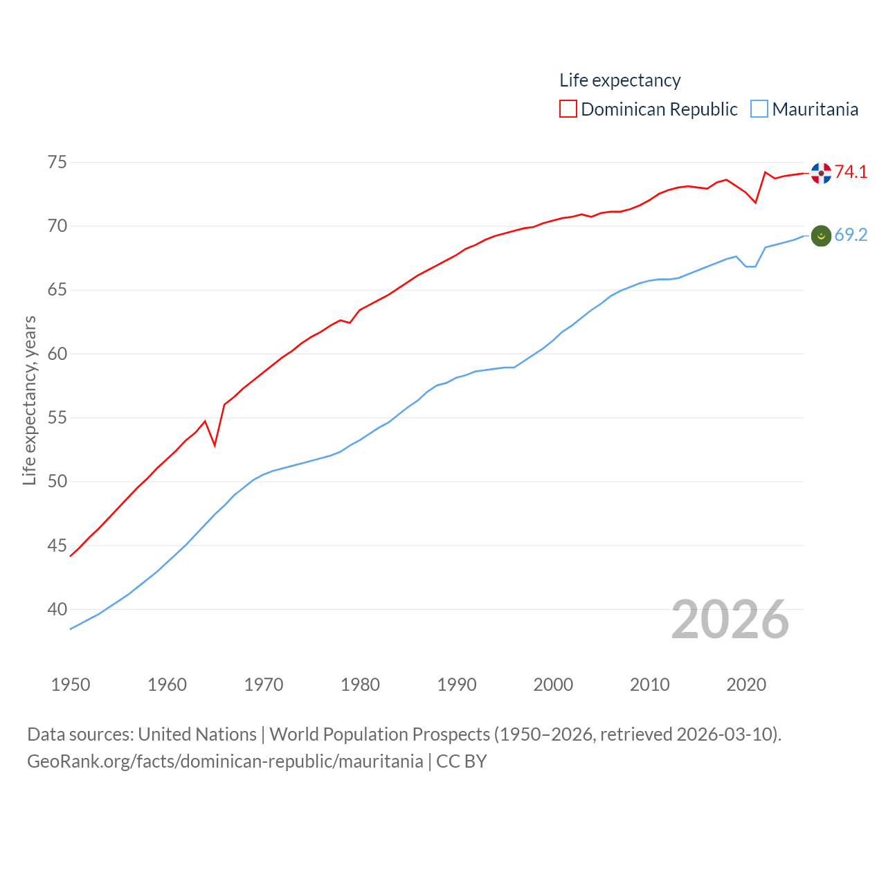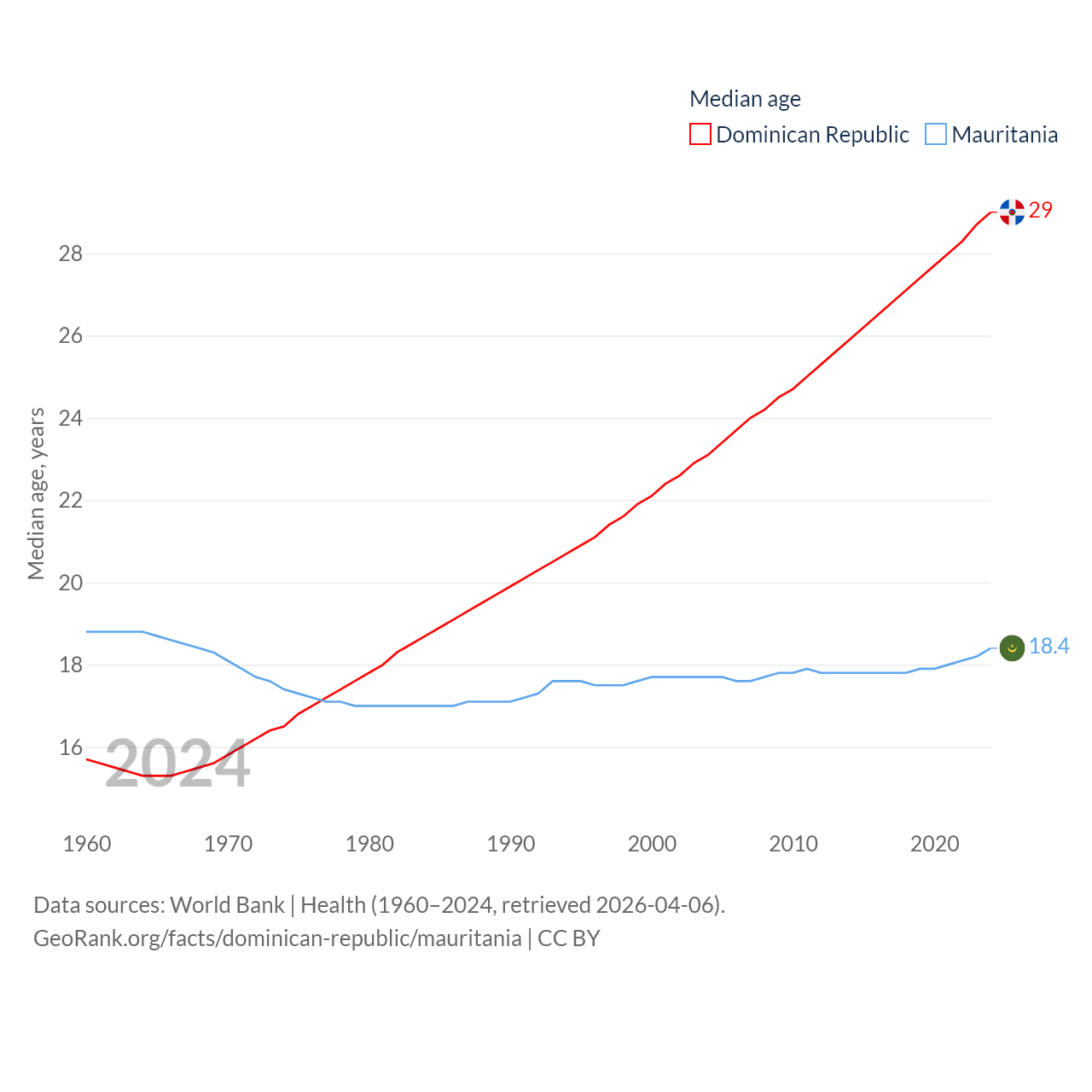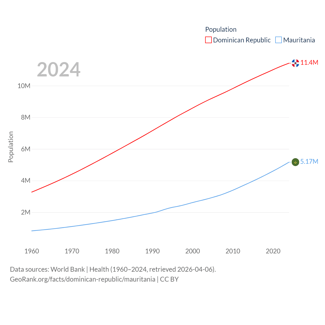 The Dominican Republic has a population of 11.4M (ranked 85/197), compared with 5.17M in Mauritania (ranked 125/197). The Dominican Republic's land area is 18,609 sq mi versus 397,955 sq mi for Mauritania (ranked 127th vs. 28th).