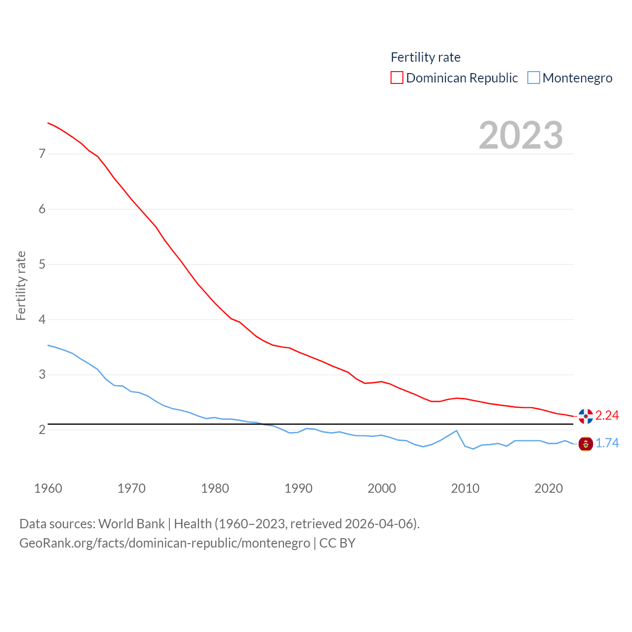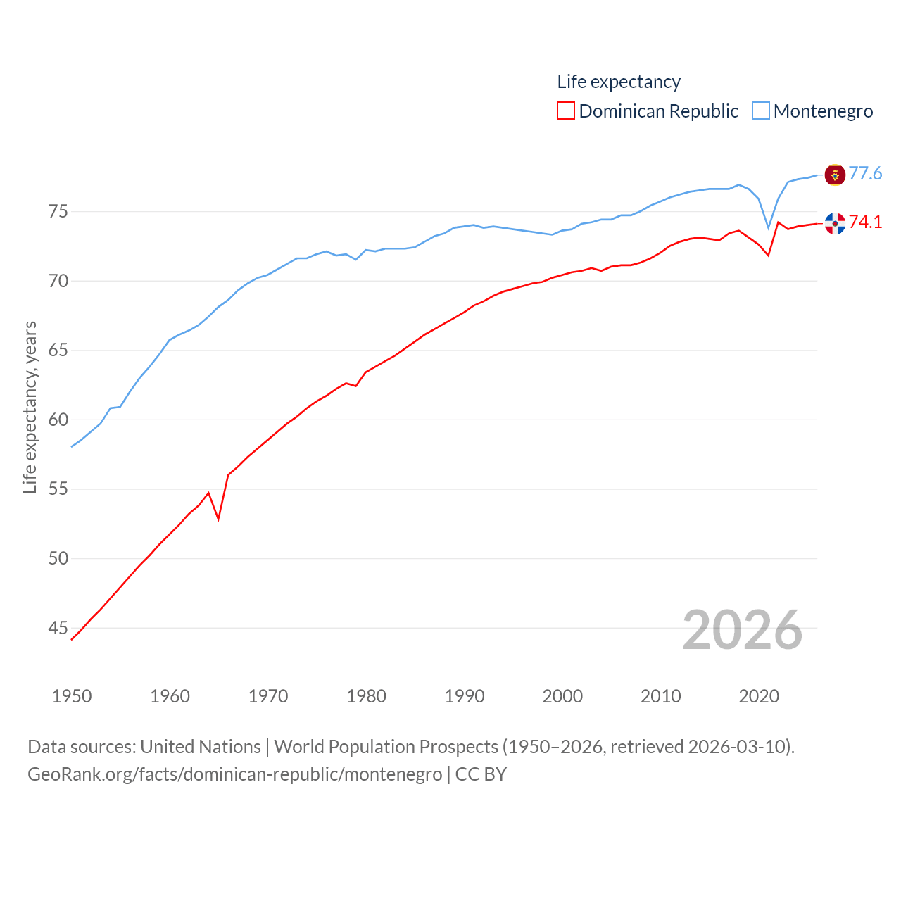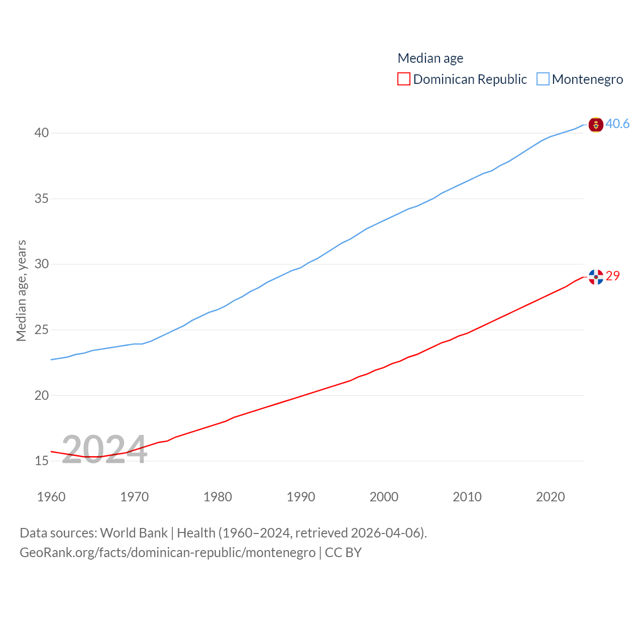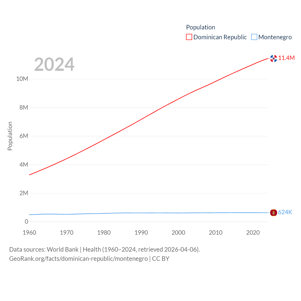 The Dominican Republic has a population of 11.4M (ranked 85/197), compared with 624K in Montenegro (ranked 166/197). The Dominican Republic's land area is 18,609 sq mi versus 5,193 sq mi for Montenegro (ranked 127th vs. 156th).