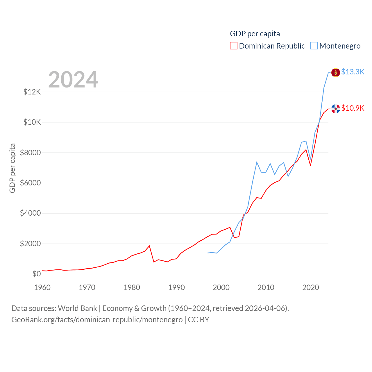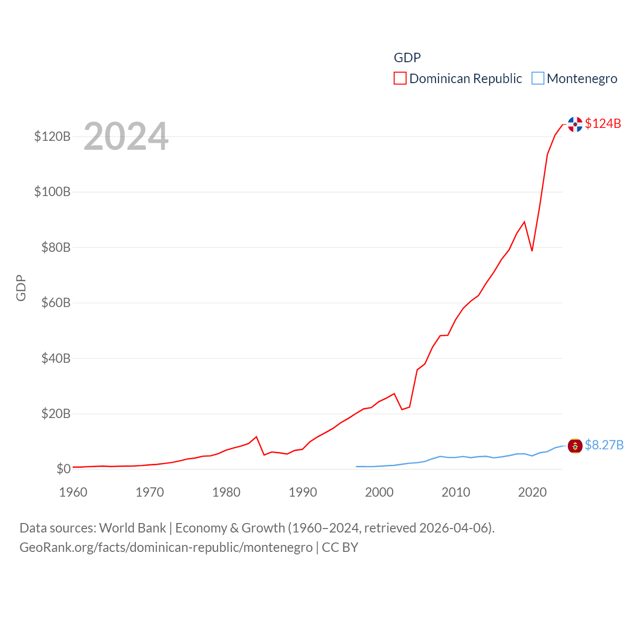 By GDP, The Dominican Republic ranks 63/197 ($124B) and Montenegro ranks 155/197 ($8.27B). By GDP per capita, The Dominican Republic ranks 83/197 ($10,876), while Montenegro ranks 77/197 ($13,263).
