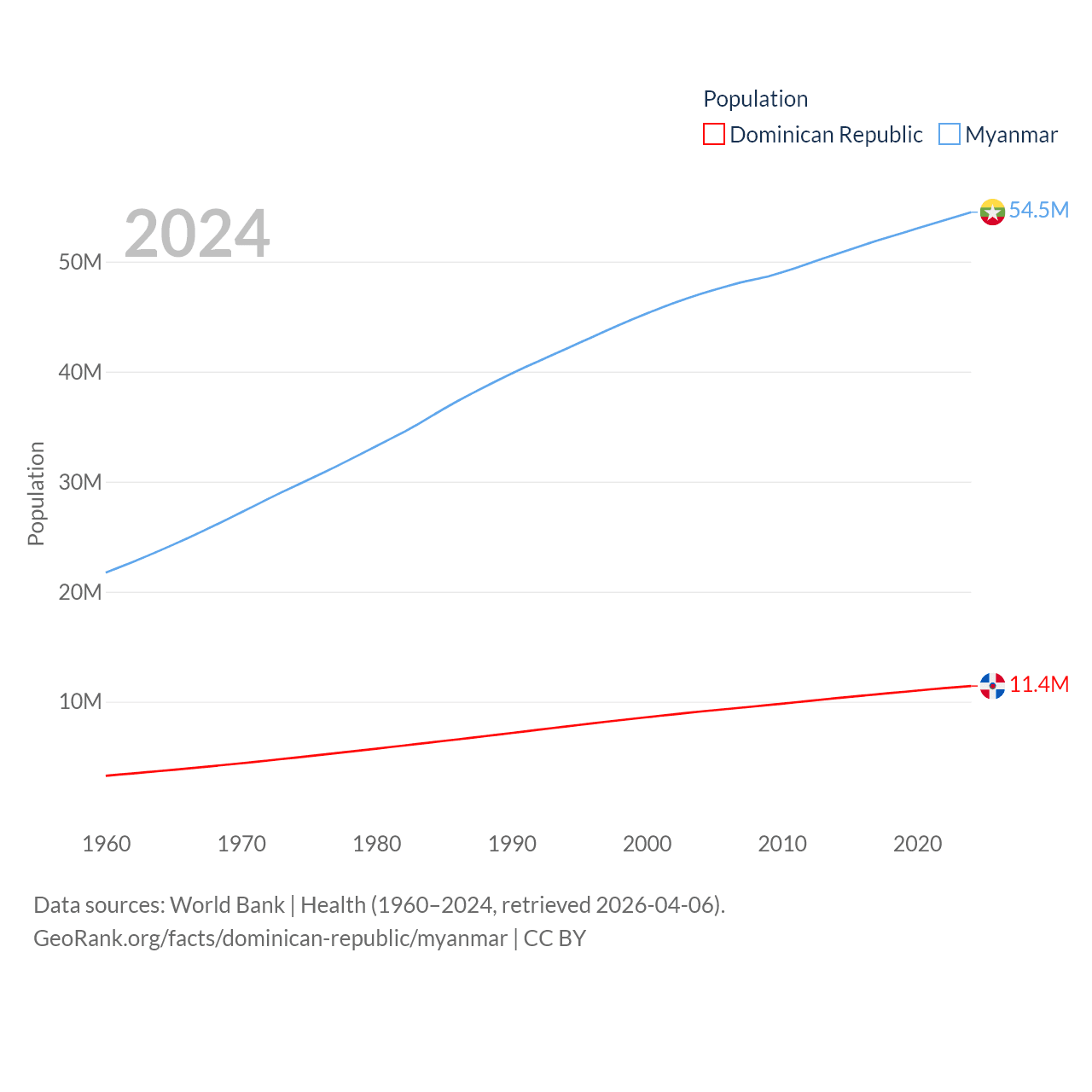 The Dominican Republic has a population of 11.4M (ranked 85/197), compared with 54.5M in Myanmar (ranked 27/197). The Dominican Republic's land area is 18,609 sq mi versus 251,997 sq mi for Myanmar (ranked 127th vs. 39th).