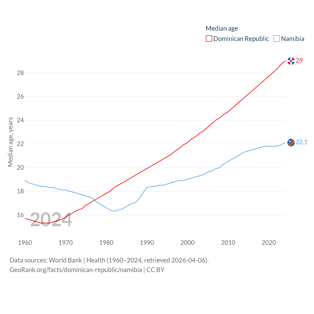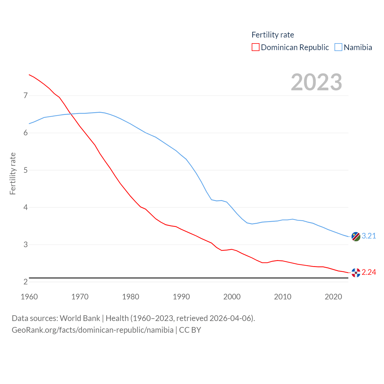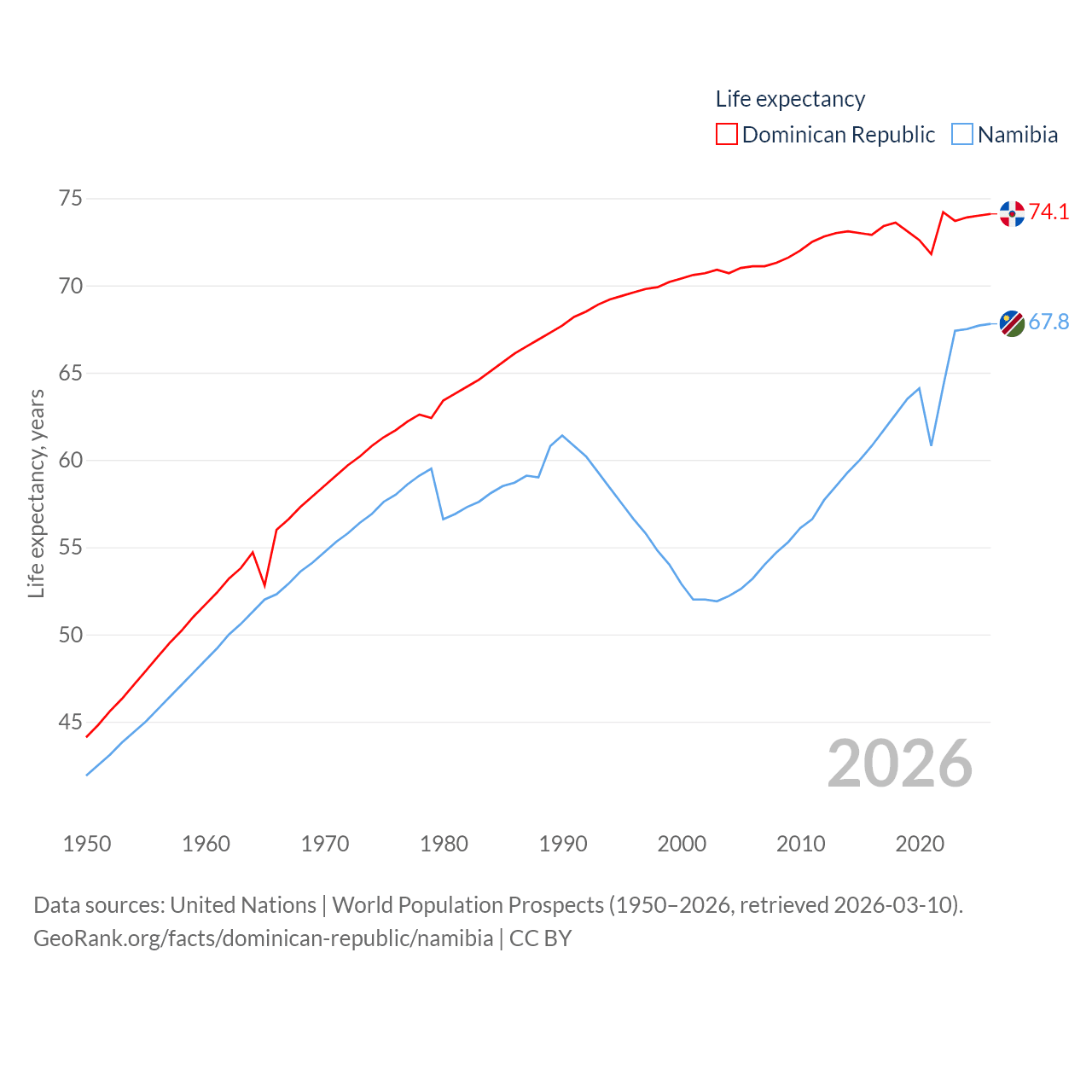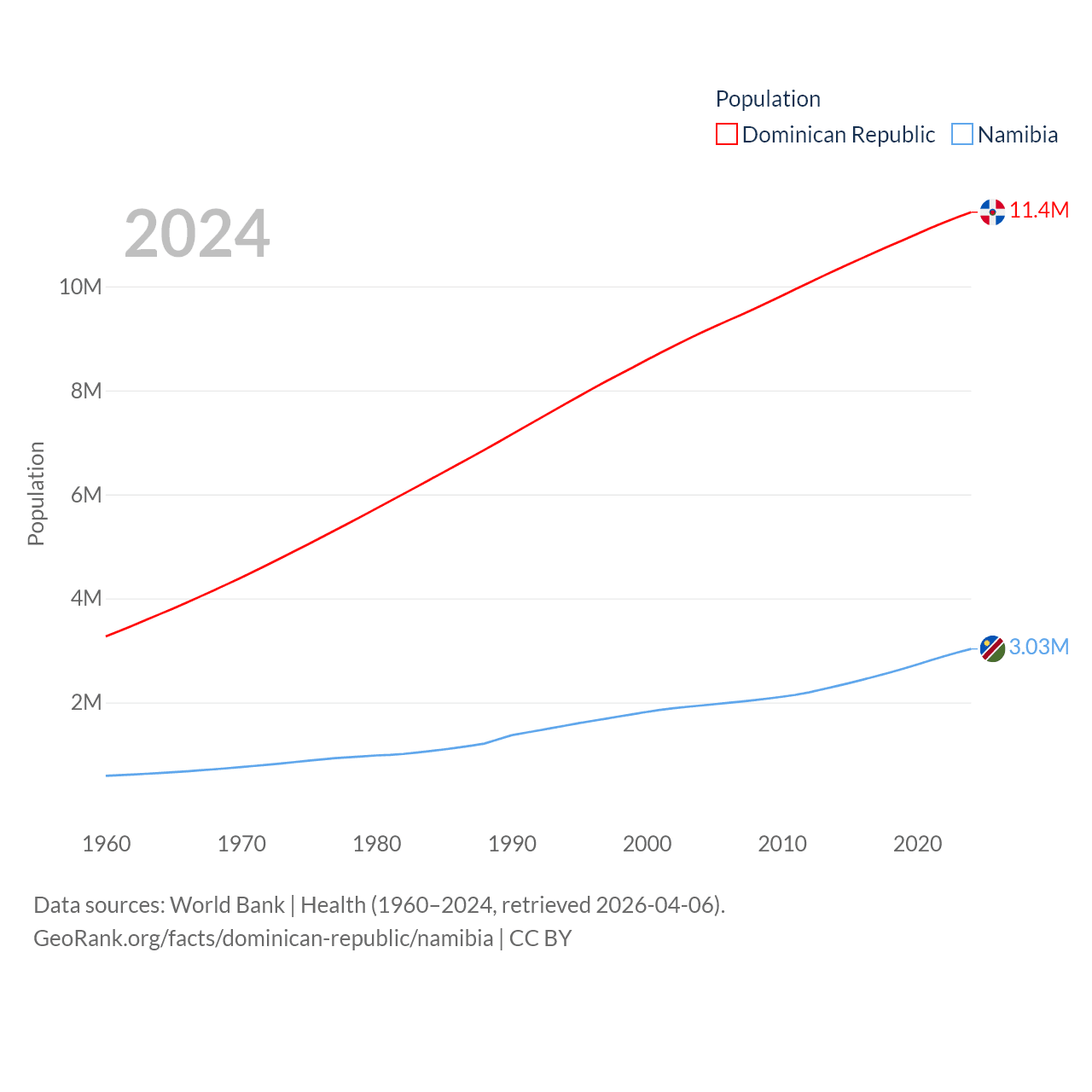The Dominican Republic has a population of 11.4M (ranked 85/197), compared with 3.03M in Namibia (ranked 136/197). The Dominican Republic's land area is 18,609 sq mi versus 317,874 sq mi for Namibia (ranked 127th vs. 33rd).