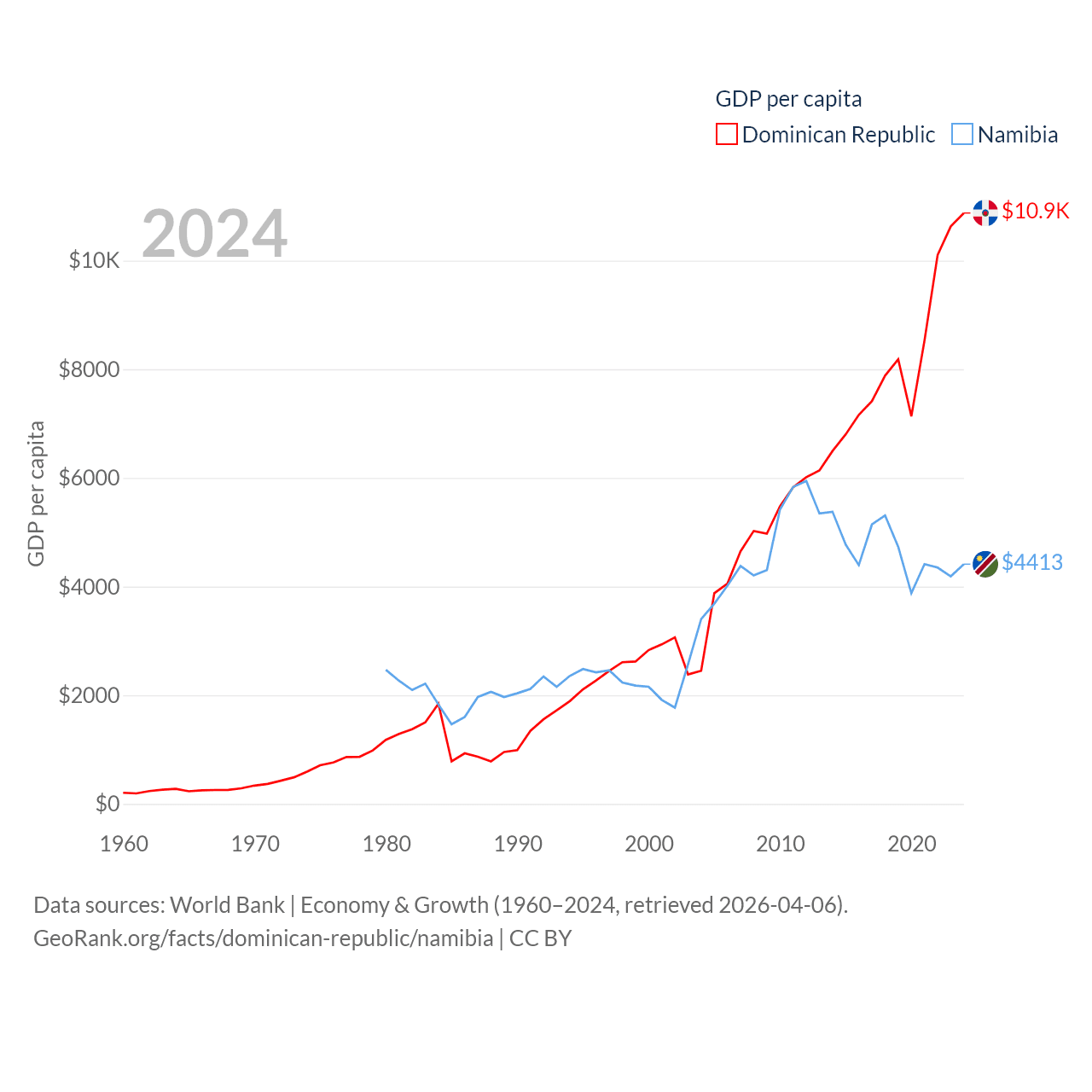 By GDP, The Dominican Republic ranks 63/197 ($124B) and Namibia ranks 147/197 ($13.4B). By GDP per capita, The Dominican Republic ranks 83/197 ($10,876), while Namibia ranks 126/197 ($4,413).