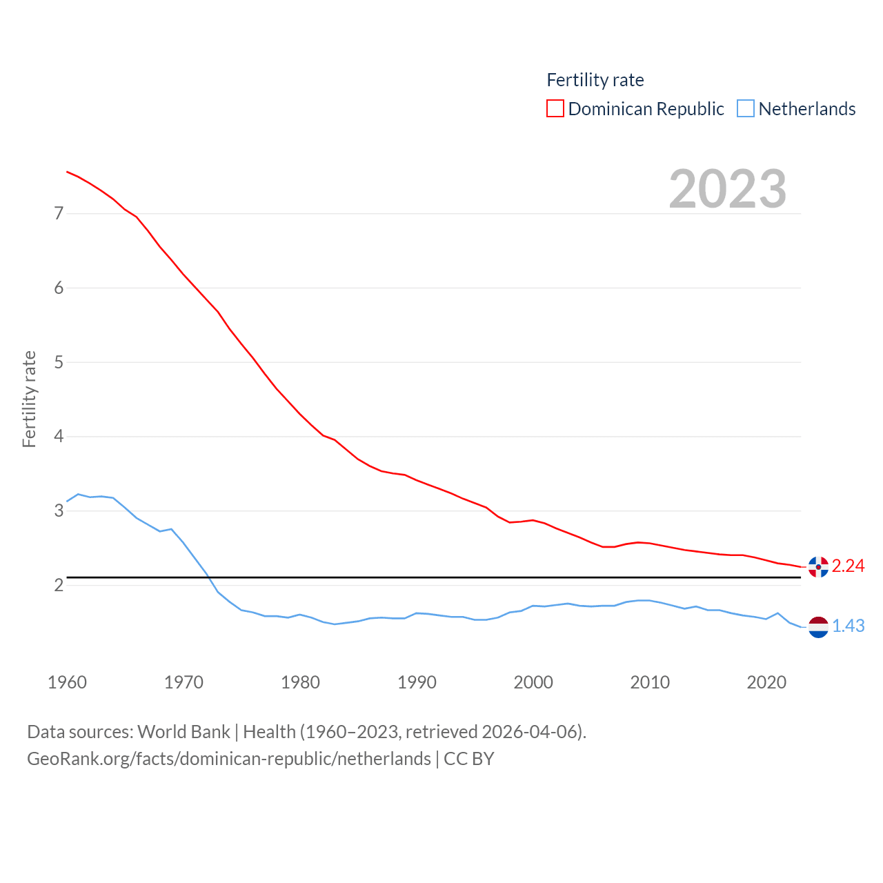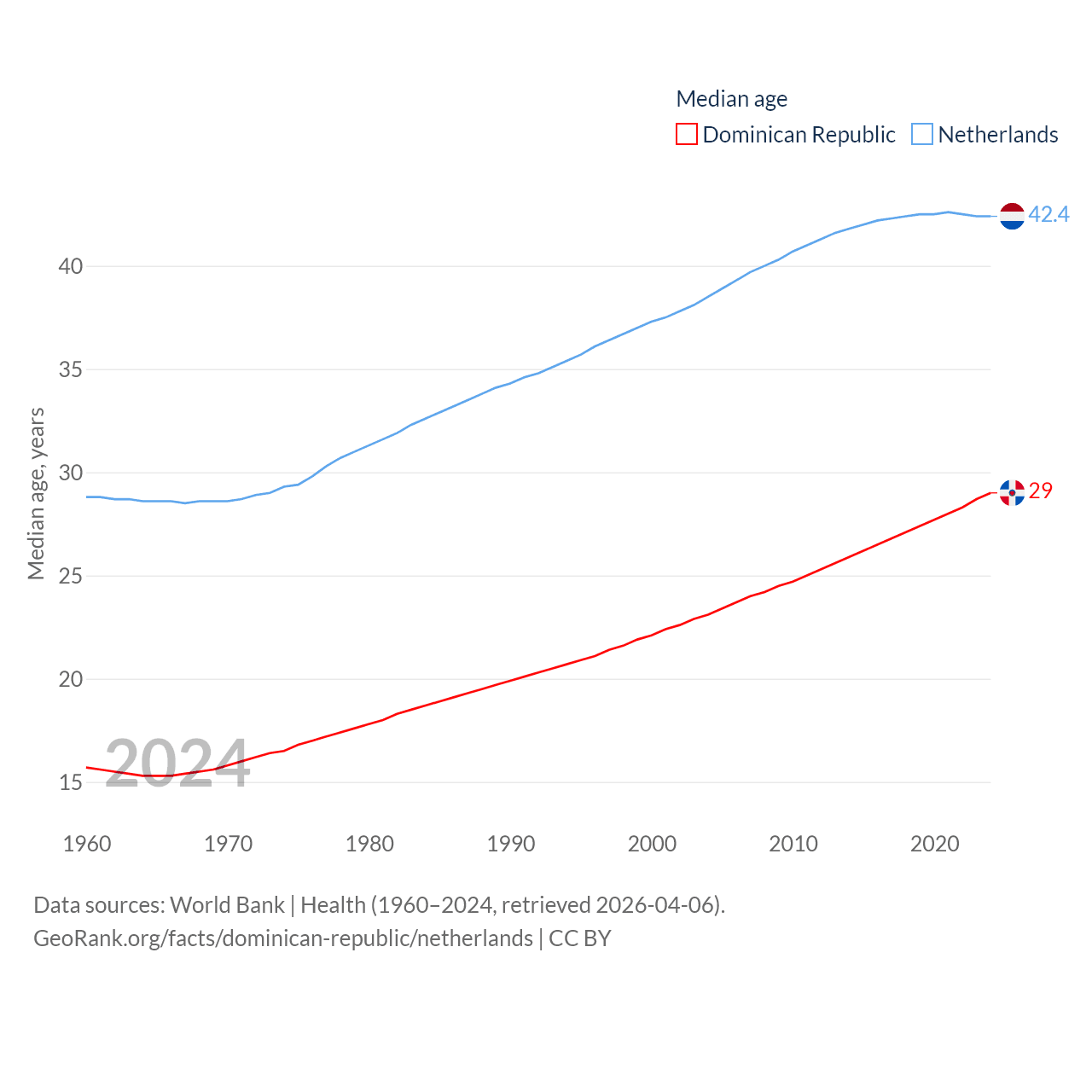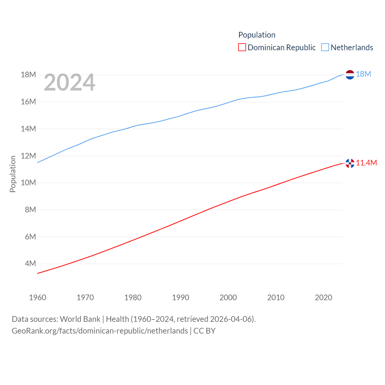 The Dominican Republic has a population of 11.4M (ranked 85/197), compared with 18M in The Netherlands (ranked 72/197). The Dominican Republic's land area is 18,609 sq mi versus 13,000 sq mi for The Netherlands (ranked 127th vs. 134th).